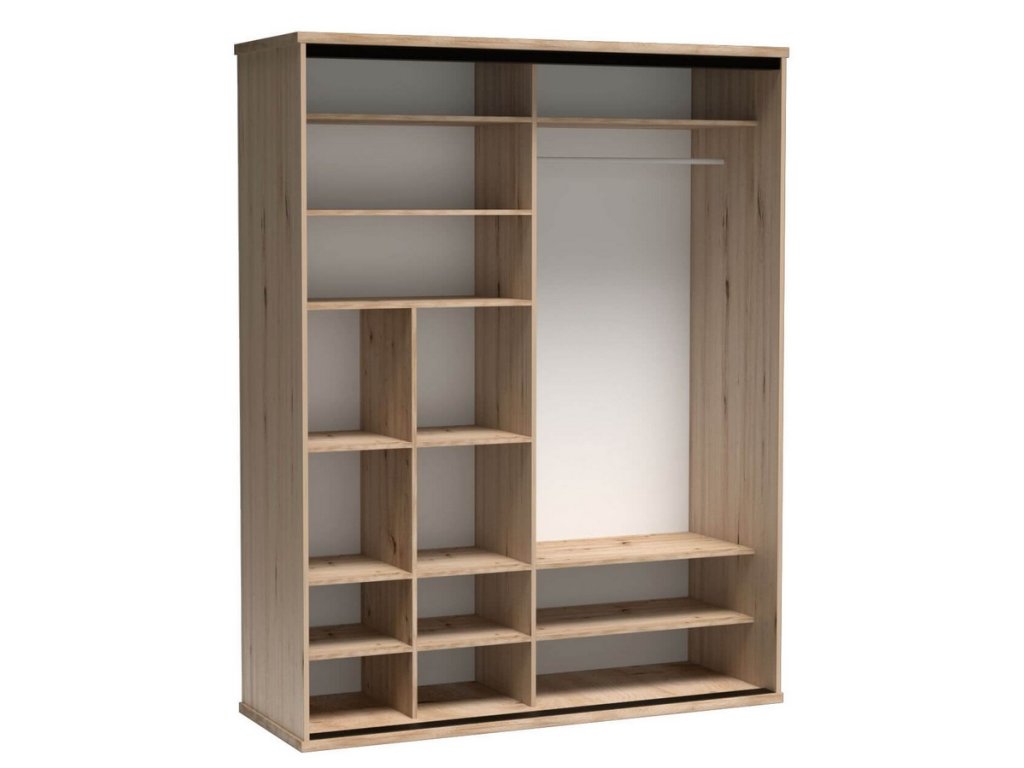 Šatní skříň s posuvnými dveřmi s netradičním provedením detailu dvířek s lamelami. Kolekce nábytku v sobě spojuje jednoduchost, originální vzhled a funkčnost. Barevné provedení je v kombinaci dub artisan/černá mat. Nábytek je vyroben z kvalitního lamina ohraničeného ABS páskou, dekorační lamely jsou vyrobeny z desky MDF. Uvnitř skříně je v pravé části šatní tyč a tři police, v levé části jsou umístěny police. Jedno křídlo posuvných dveří je doplněno zrcadlem. Kolekce se skládá z mnoha prvků a tento široký výběr Vám zaručí sestavit si nábytek podle svých vlastních představ a přání. Dodáváme v demontovaném stavu.Doplňkové parametry