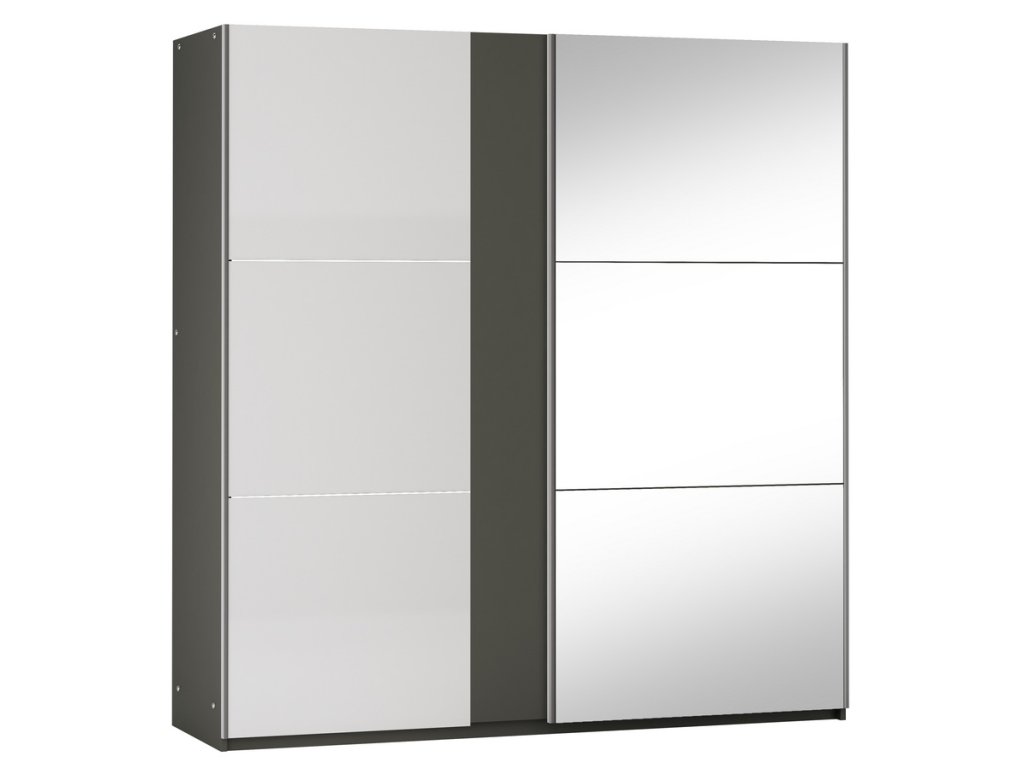 Šatní skříň s posuvnými dveřmi v moderním provedení vhodná do monochromatického interiéru. Korpus je z kvalitní LTD desky grafitové barvy. Dveře jsou v barevné kombinaci grafit/bílý lesk doplněné zrcadlem. Skříň obsahuje praktické LED pásky ve dveřích v ceně. Uspořádání polic viz. obrázek. Dodáváme v demontovaném stavu.Doplňkové parametry