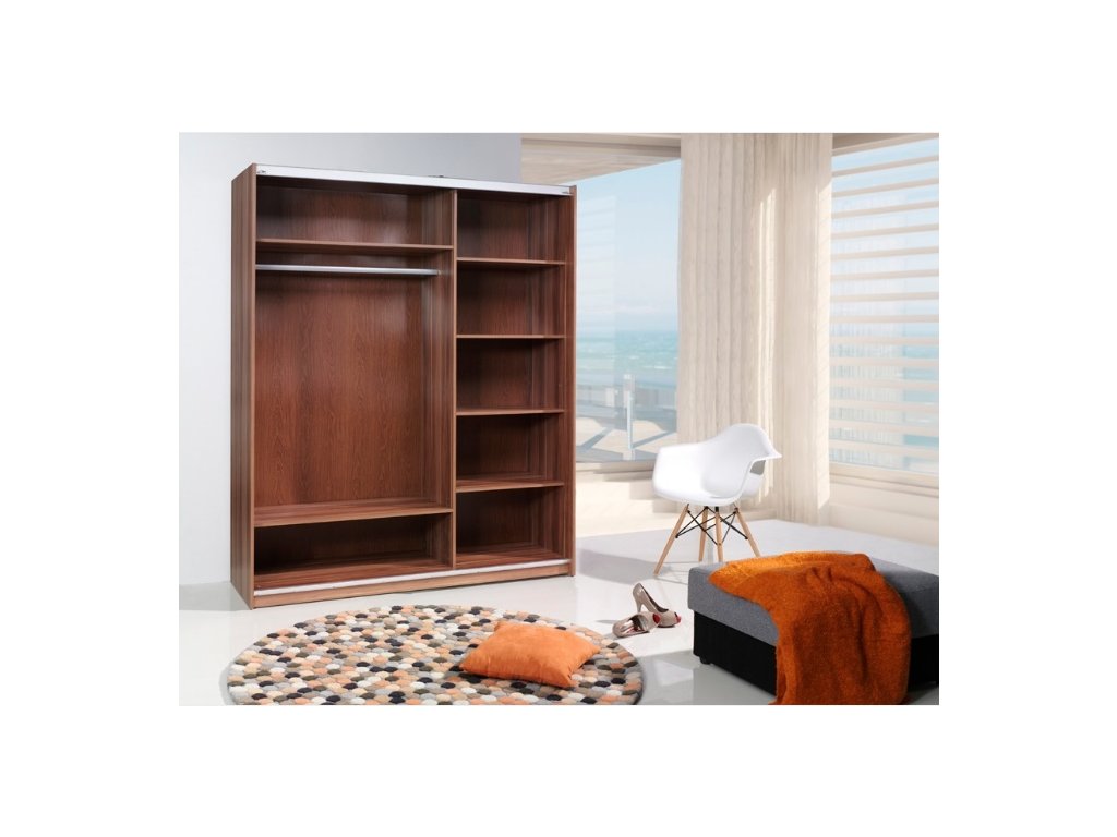 Šatní skříň s posuvnými dveřmi, které šetří prostor. Uvnitř skříně najdete tyč na zavěšení ramínek a několik menších i větších polic.