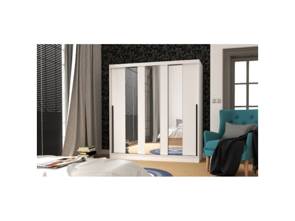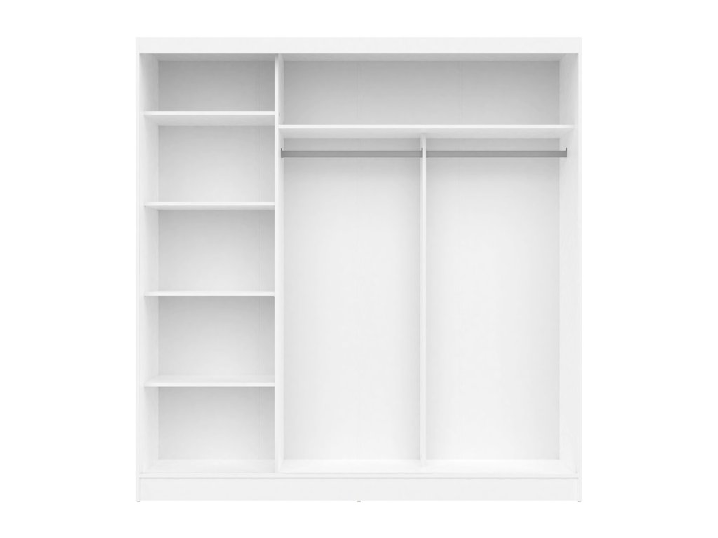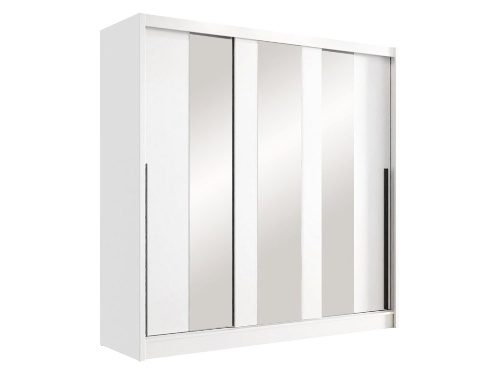 barevné provedení bílá 3 posuvné dveře, 3 úzká zrcadla o tloušťce 3 mm, plastové úchytky prostor dělený v poměru 1:2 v levé užší části 4 police o šířce 61 cm v pravé širší části 2 šatní tyče, každá v délce 68 cm a police na klobouky o šířce 138 cmDoplňkové parametry