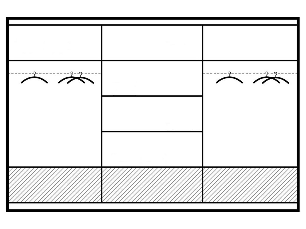 Šatní skříň s třemi posuvnými dveřmi v moderním provedení. Prostřední část je policová, krajní mají šatní tyč. Korpus je z kvalitního LTD v barvě ořech. Dveře jsou ze skla v bílé barvě a prostřední dveře jsou ze zrcadla. Skříň má dole tři praktické zásuvky. Uspořádání polic viz. perokresba. Otevírání pomocí kvalitního systému SEVROLL. Elegantní LED osvětlení je v ceně. Dodáváme v demontovaném stavu.Doplňkové parametry