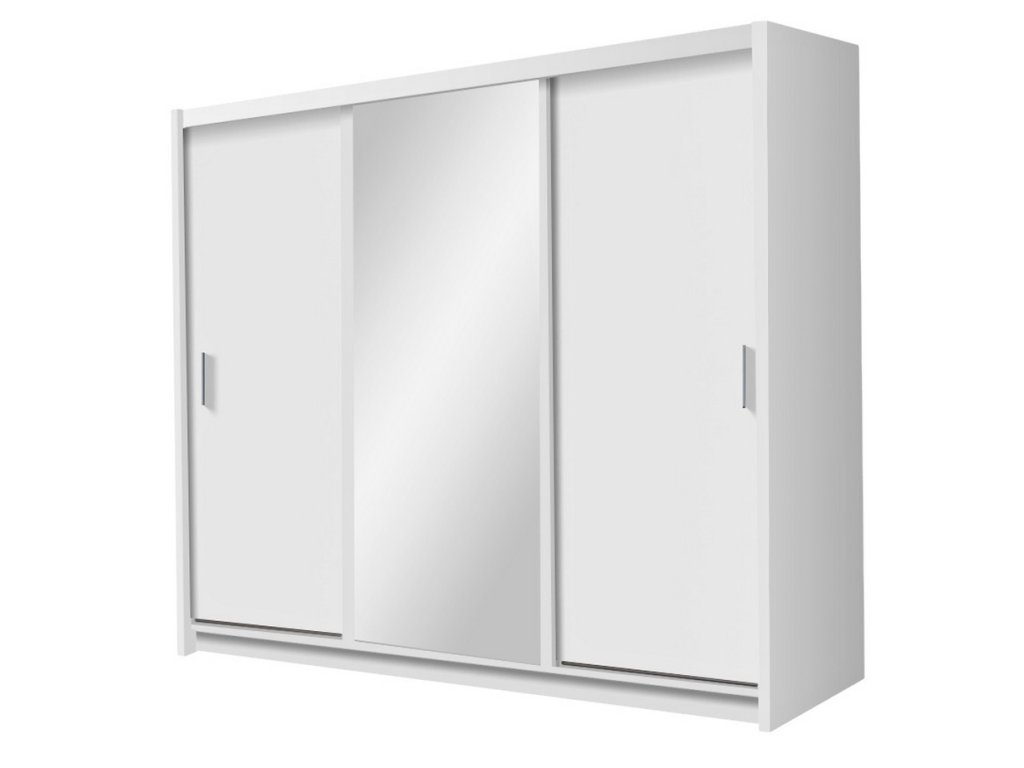 Šatní skříň s posuvnými dveřmi v moderním provedení. Korpus i dvířka jsou z kvalitního LTD a barevné provedení je bílá. Dveře obsahují praktické zrcadlo. Uspořádání polic viz. perokresba. Dodáváme v demontovaném stavu.Doplňkové parametry