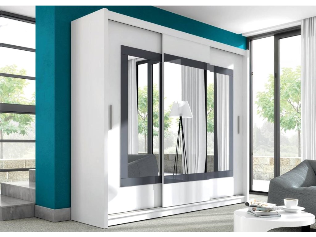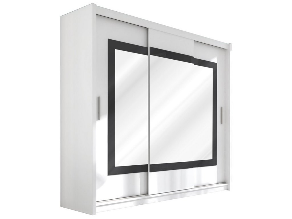 Šatní skříň s posuvnými dveřmi v moderním provedení. Korpus i dvířka jsou z kvalitního LTD v barvě bílé. Velké zrcadlo je umístěné uprostřed dveří a lemované šedým sklem. Skříň má šatní tyč uprostřed a po bokách police. Uspořádání polic viz. perokresba. Posuvné dveře jsou postavené na velmi kvalitních hliníkových kolejnicích. Dodáváme v demontovanémDoplňkové parametry