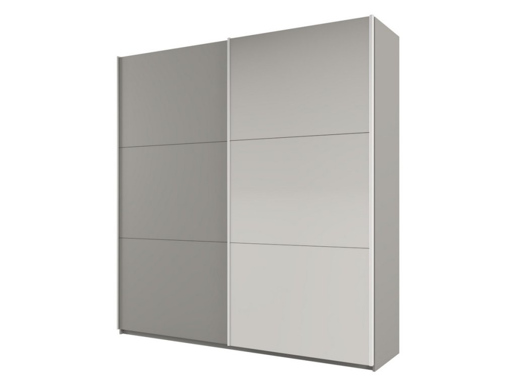 Šatní skříň s posuvnými dveřmi v jednoduchém moderním provedení. Korpus i dvířka jsou z kvalitní LTD desky v barvě platinum. Dveře jsou dekorovány zrcadlem. Otevírání dveří zajišťuje posuvné kování značky Häfele. Uspořádání polic viz. perokresba. Dodáváme v demontovaném stavu.Doplňkové parametry
