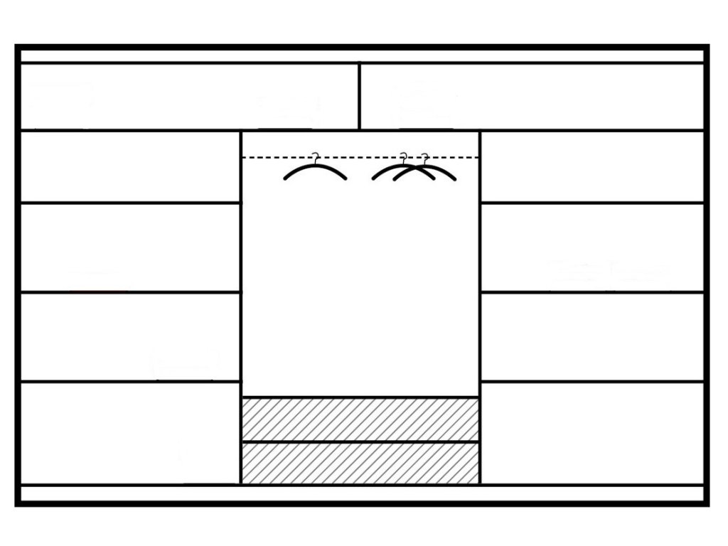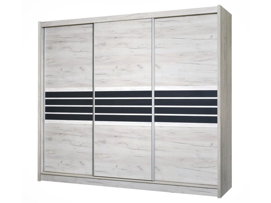 Šatní skříň s posuvnými dveřmi v moderním provedení. Korpus i dvířka jsou z kvalitního LTD v barvě dub craft. Uprostřed dveří je aplikace z grafitového skla. Skříň má šatní tyč, police a 2 zásuvky. Uspořádání polic viz. perokresba. Posuvné dveře jsou postavené na velmi kvalitních hliníkových kolejnicích. Dodáváme v demontovaném stavu.Doplňkové parametry