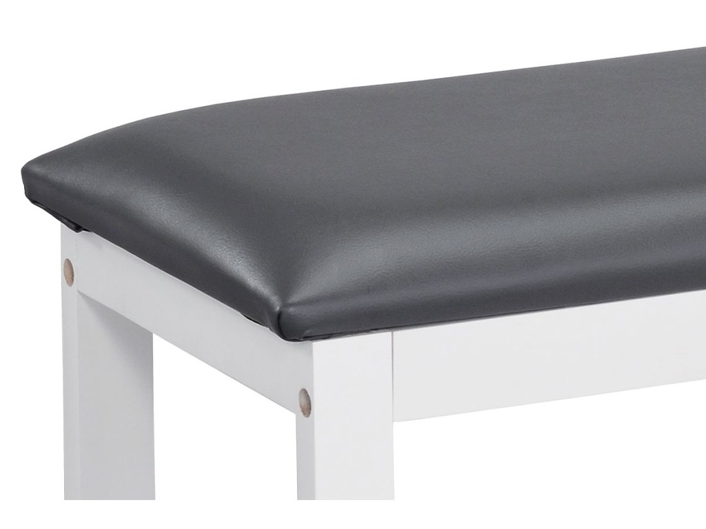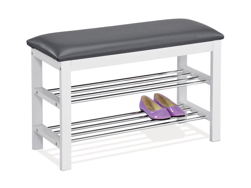 Dřevěný botník namořený do bílé barvy se sedákem v šedé kožence. Tloušťka chromových trubek je 12 mm.Additional parameters