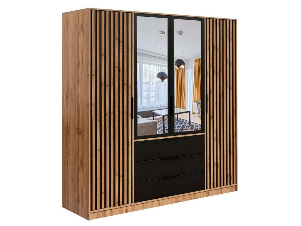 Šatní skříň BASILIO LUX 196 dub wotan/černá/zrcadlo