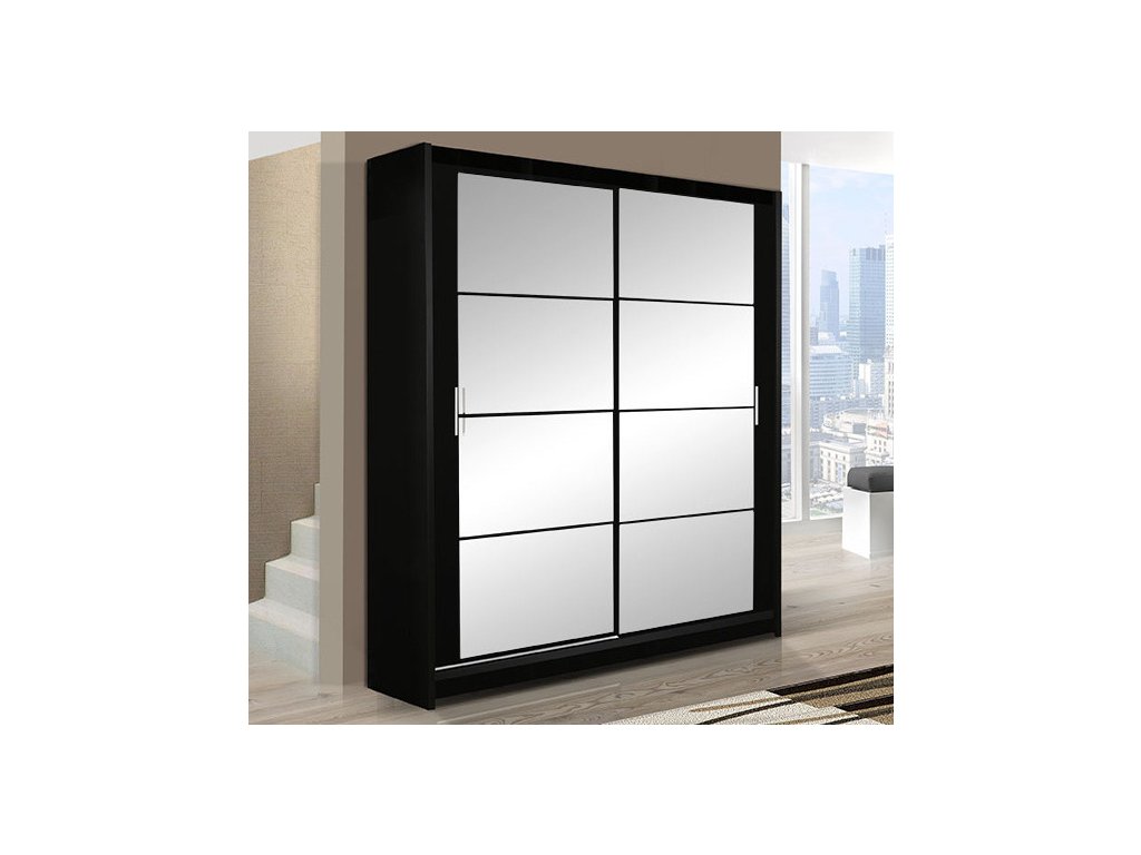 Šatní skříň s posuvnými dveřmi v moderním provedení. Korpus i dvířka jsou z kvalitního LTD v barvě černá. Skříň obsahuje praktické zrcadlo. Uspořádání polic viz. perokresba. Dodáváme v demontovaném stavu.Additional parameters