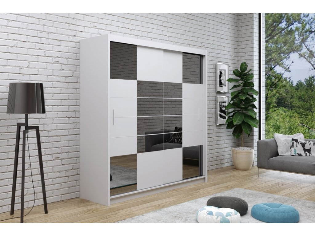 Šatní skříň s posuvnými dveřmi v moderním provedení, které nikdy není monotónní nebo nudné. Korpus i dvířka jsou z kvalitní LTD desky. Korpus je bílý, dveře jsou v barvě bílá a jsou dekorovány grafitovým zrcadlem. Uspořádání polic viz. perokresba. Dodáváme v demontovaném stavu.Additional parameters