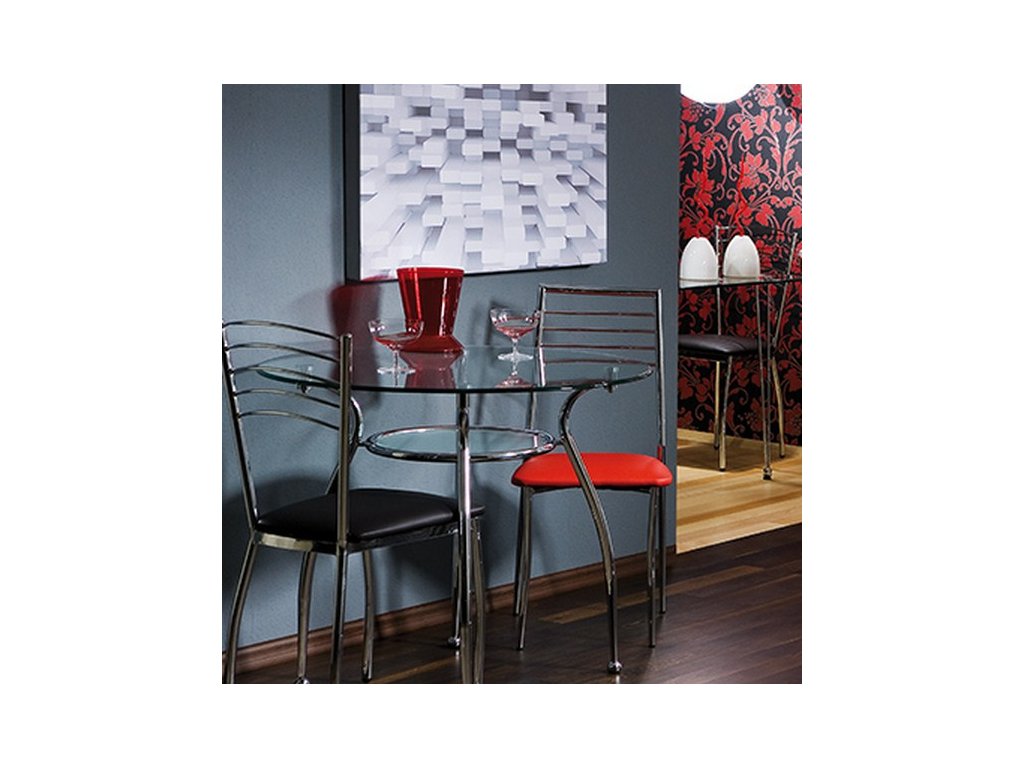 Stylový jídelní stůl v zajímavém provedení. Elegantní zpracování tvaru noh a kulatého skla. Kovová konstrukce je pochromovaná, vrchní deska je z průhledného tvrzeného skla, odkládací polička je z mléčného skla. Stůl je vhodný pro 4 osoby.Additional parameters