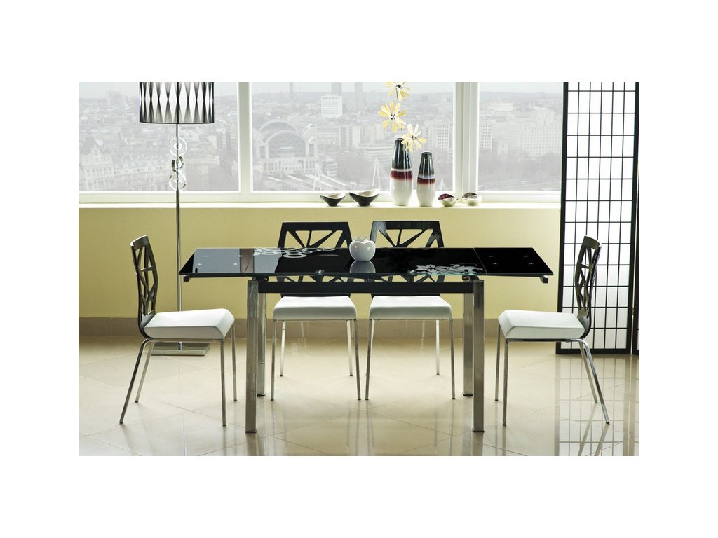 Moderní rozkládací jídelní stůl, kovová konstrukce je pochromovaná, vrchní rozkládací deska je z černého tvrzeného skla, tloušťka skla je 1 cm. Rozkládací části ( každá 30 cm ) se nacházejí na dvou protilehlých stranách, plocha má před rozložením 110 x 74 cm, po rozložení 170 x 74 cm. Stůl je vhodný pro 4-6 osob. K tomuto stolu doporučujeme židle v naší uvedené nabídce.Additional parameters