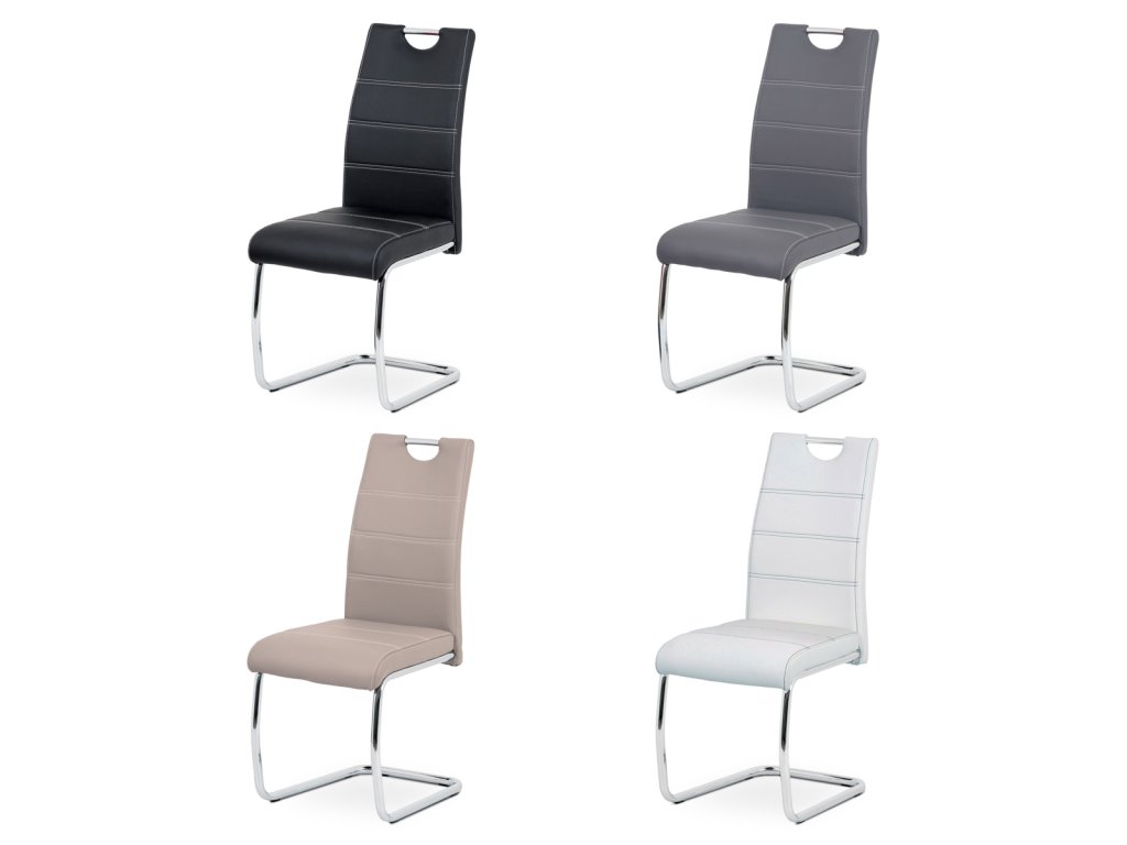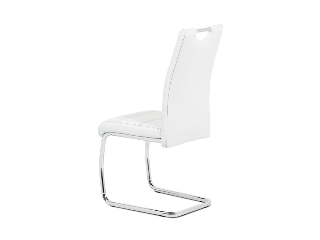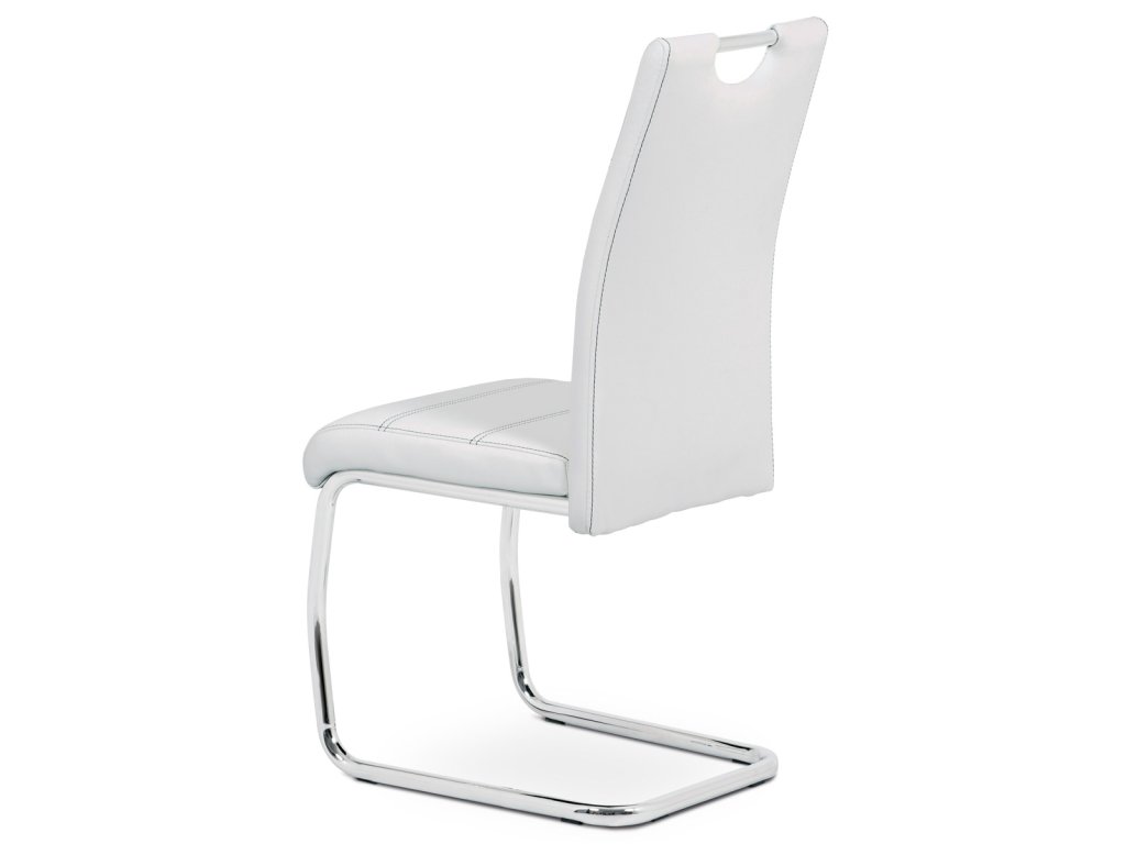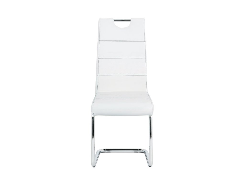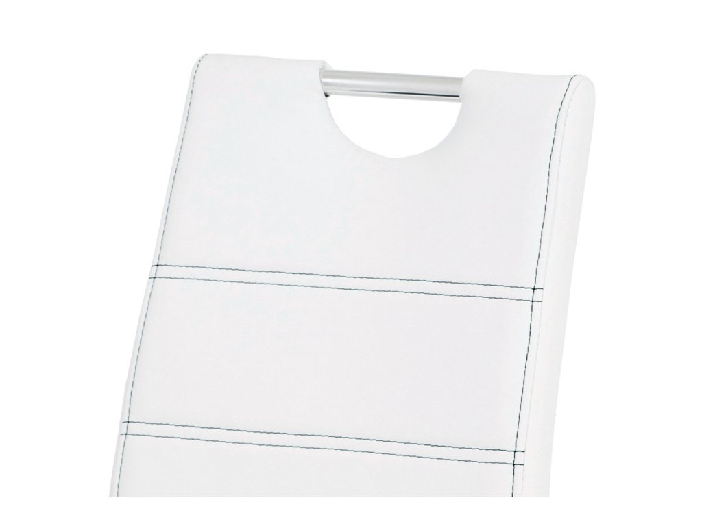 Moderní jídelní židle je čalouněná bílou ekokůží s dekorativním černým prošitím sedáku i opěráku. Moderní vzhled podtrhuje kovová pohupová podnož s chromovou úpravou. Podnož je navíc speciálně tvarovaná pro lepší stabilitu a bezpečí a je na šesti černých plastových kluzácích, které sníží riziko poškození Vaší podlahy. Pro snazší manipulaci má židle i madlo v horní části opěráku, které je kovové a též s chromovou úpravou. Nosnost židle je až 110 kg.Additional parameters