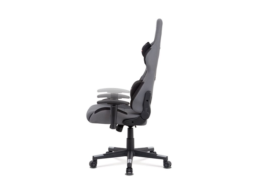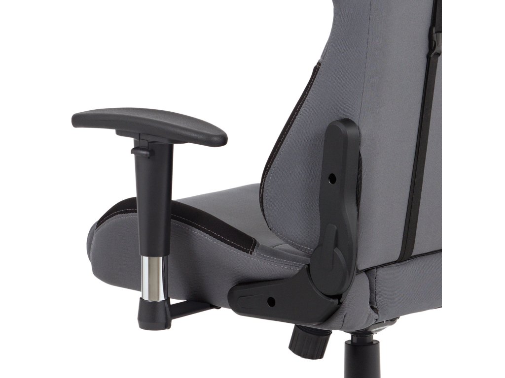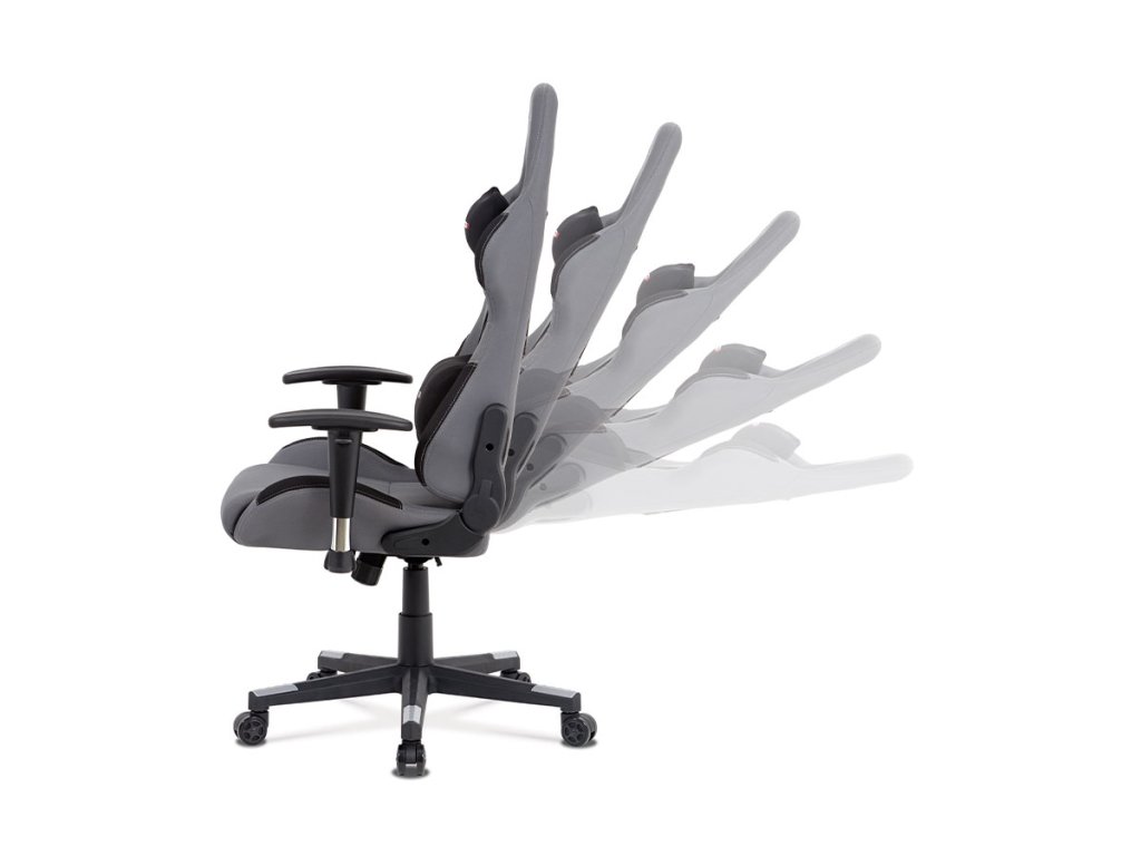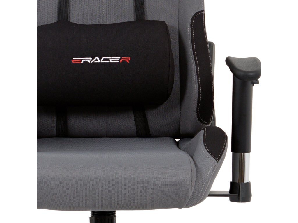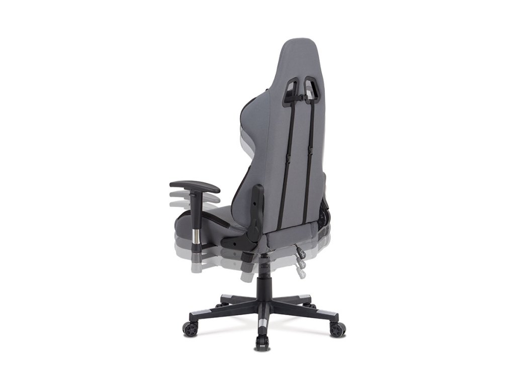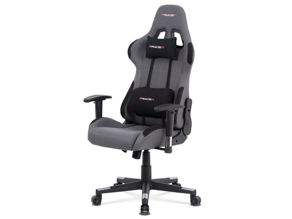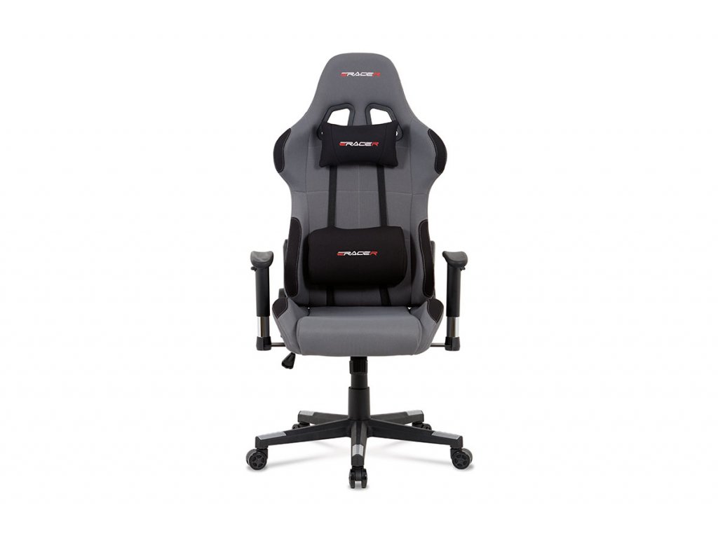 Kancelářská židle ve sportovním designu v šedé látce s černými detaily se stane nezbytným doplňkem každého závodníka. Polohovací opěrák, který lze sklopit na 180° a houpací mechanismus zajistí komfortní užívání, stejně tak i bederní polštářek nebo polštářek pod hlavu, které lze odepnout. Židle má také nastavitelné područky, plastový kříž a pogumovaná kolečka vhodná na tvrdé podlahy.