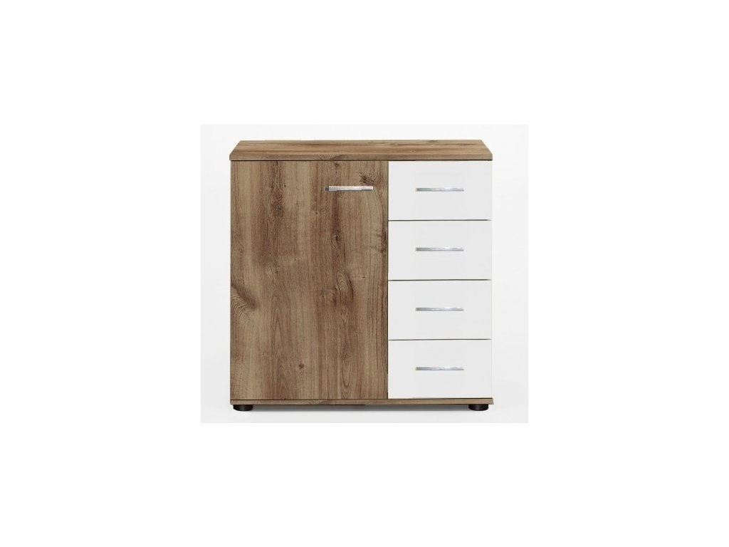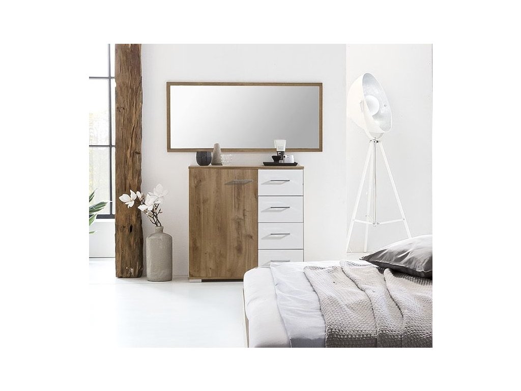 Komoda v krásném elegantním provedení z ložnicové kolekce PAMELA. Komoda má 1 dvířka a 4 praktické zásuvky.Korpus i dvířka jsou z kvalitní LTD v barvě divoký dub ( dubové prkna ) v kombinaci s alpskou bílou. Ložnicová sestava PAMELA se skládá z několika různých prvků nábytku a to Vám dává možnost sestavit si ložnici podle svých vlastních představ. Dodáváme v demontovaném stavu.Additional parameters