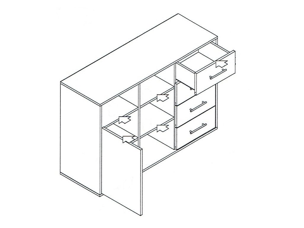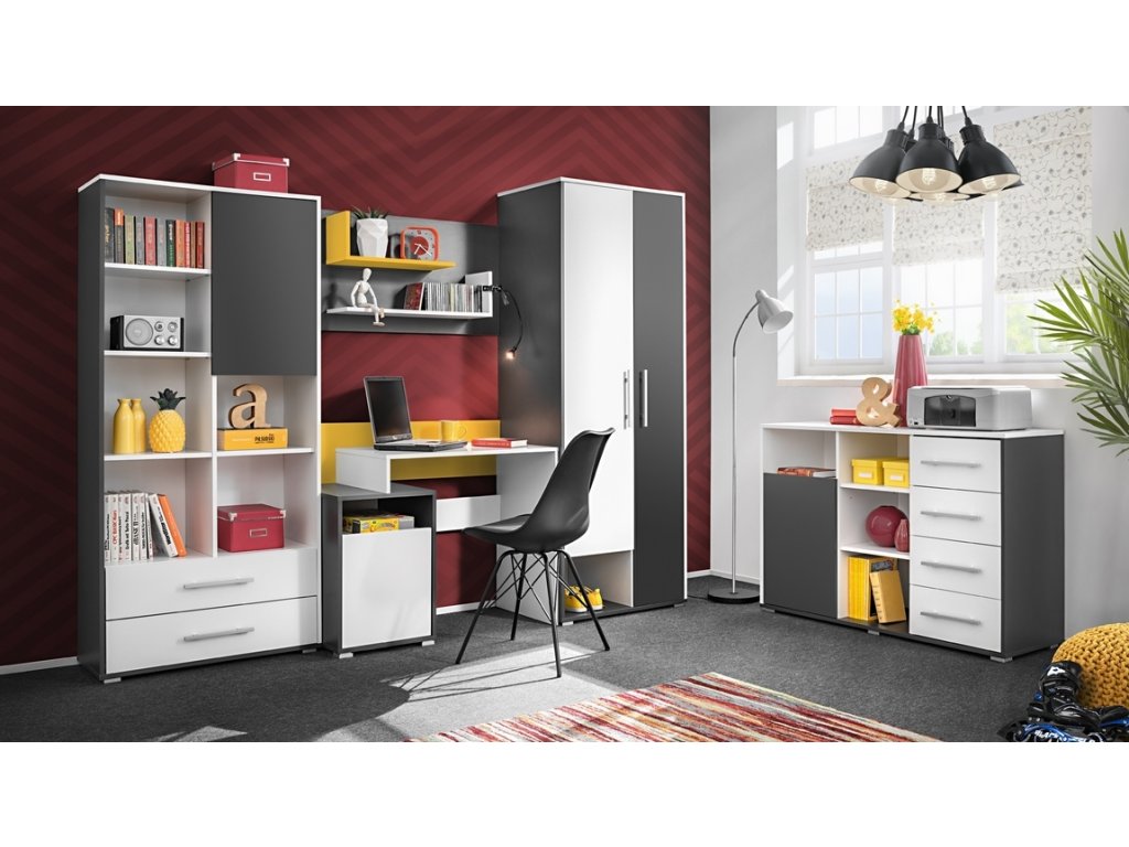 Moderní komoda. Komoda je jednodveřová se čtyřmi praktickými zásuvkami a policemi. Praktický nábytek do dětského pokoje vhodný jak pro holky, tak i kluky. Barvy jsou neutrální, jedná se o šedou v kombinaci s bílou mat. Nábytek je vyroben z kvalitního lamina. Dodáváme v demontovaném stavu.Additional parameters