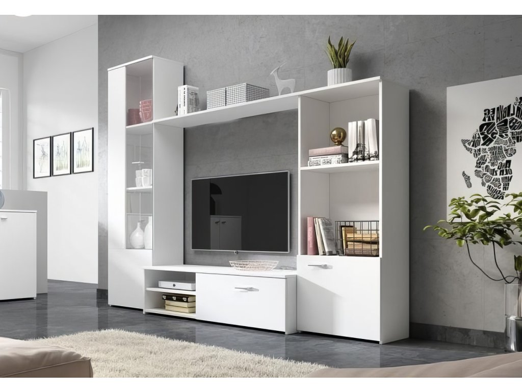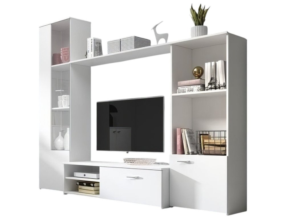 Obývací stěna v elegantním designu. Nábytek je v barevném provedení bílá mat. Nábytek je vyroben z kvalitního lamina vše hraněné ABS páskou. Lamino je odolné proti poškrábání, poškození, vlhkosti a vysokým teplotám. Úchyty jsou z plastu. Sestava se skládá ( v/š/h ) - vitrína ( 179 x 50 x 31 cm ), tv stolek ( 33 x 120 x 41 cm ) a skříňka s policí ( 134 x 50-170 x 31 cm ). Doporučujeme dokoupit komodu. Nábytek dodáváme pouze jako sestavu v demontovaném stavu.Additional parameters