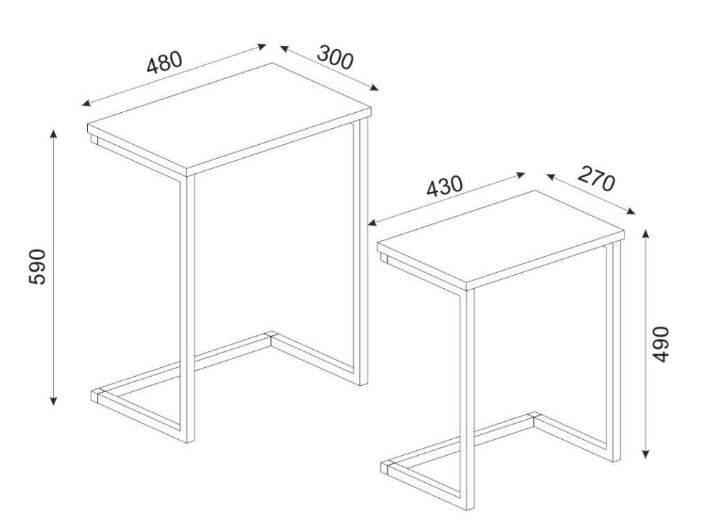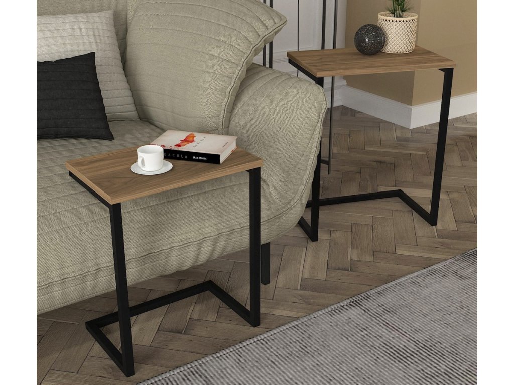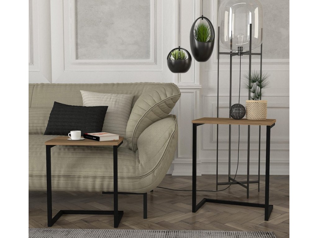 Set 2 ks stolků, MDF deska, dekor staré dřevo, kovová podnož, černý lak