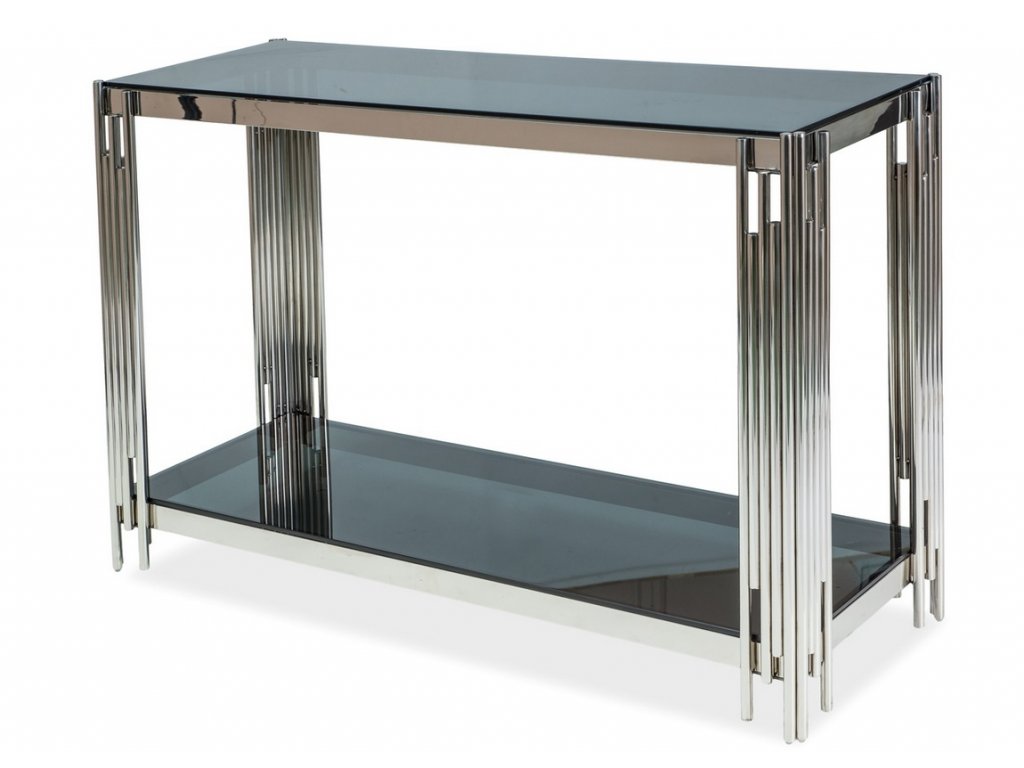 Konzolový stolek v moderním stylu glamour. Konstrukce je z kovu v barvě chróm, odkládací desky jsou z tvrzeného kouřového skla. Tento stylový kousek v netradičním dizajnu se bude vyjímat v každém interiéru. Dodáváme v demontovaném stavu.Additional parameters
