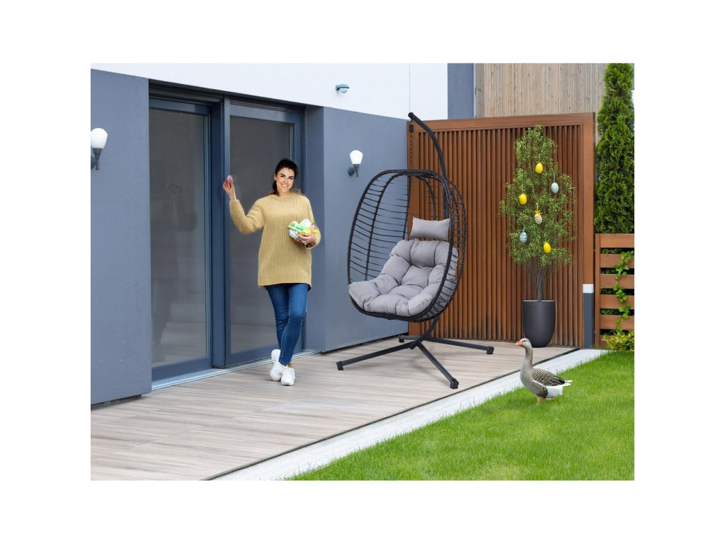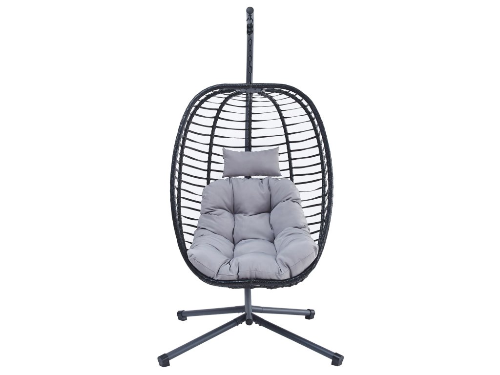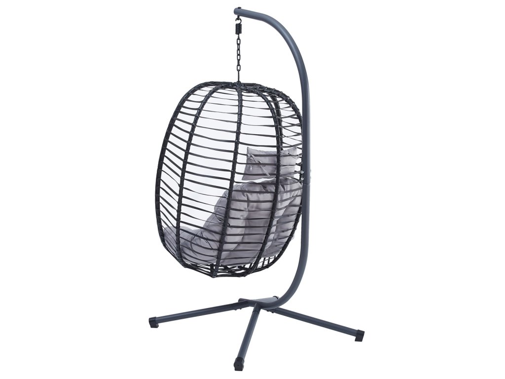 Zahradní závěsné křeslo, výplet antracit umělý ratan, potah šedá látka