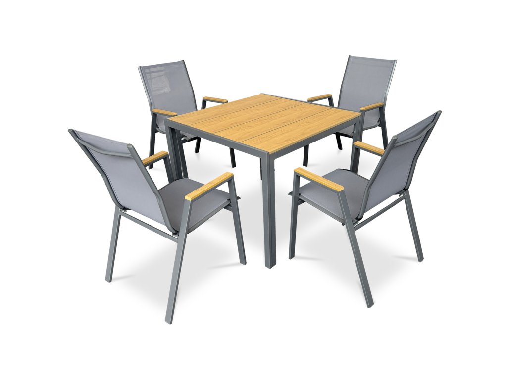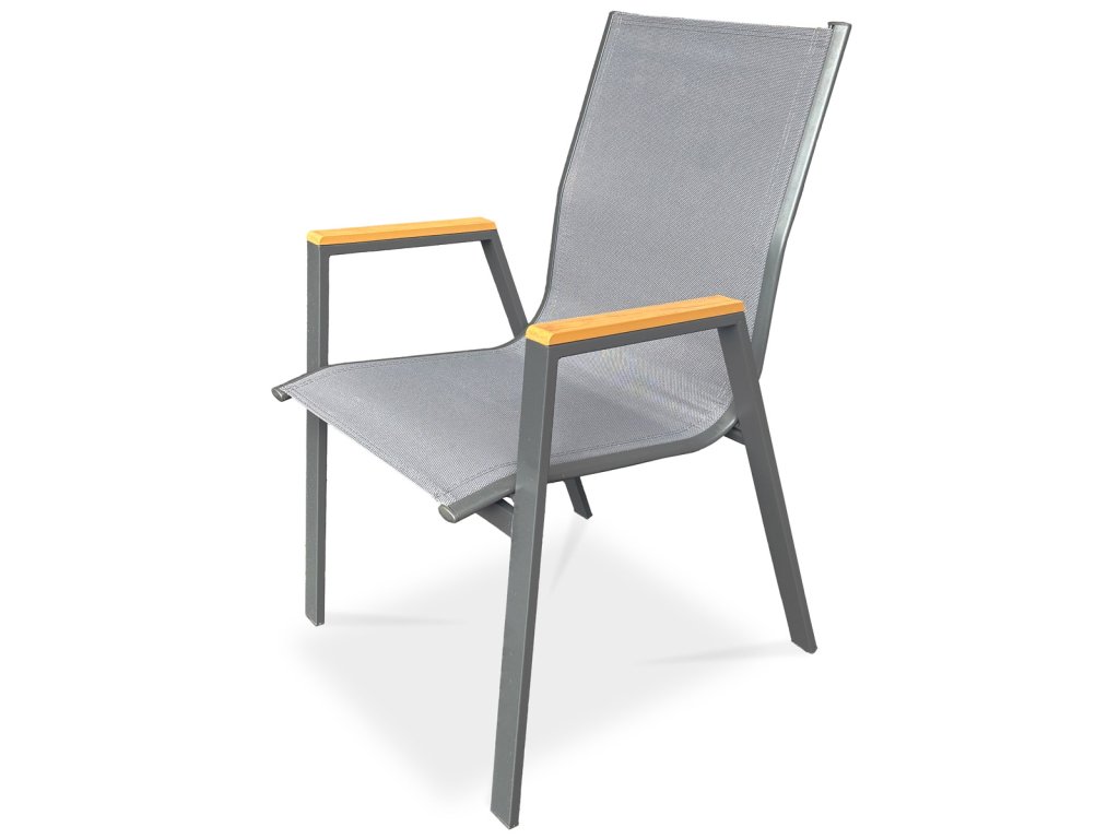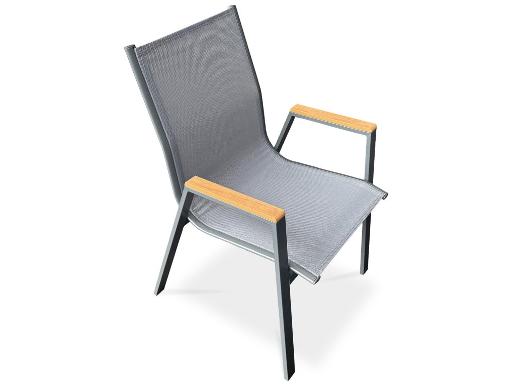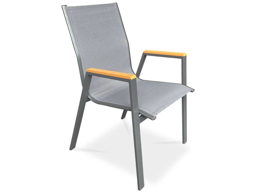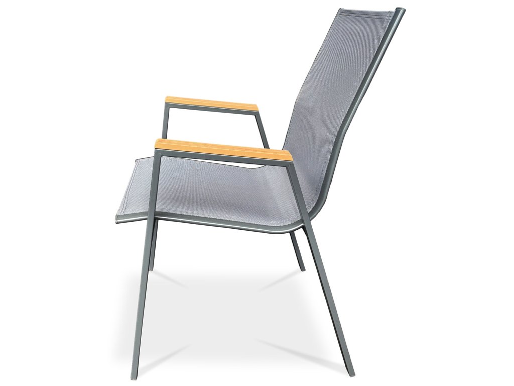 Židle zahradní šedý textilen, šedá kovová konstrukce, područky polywood v dekoru dubu