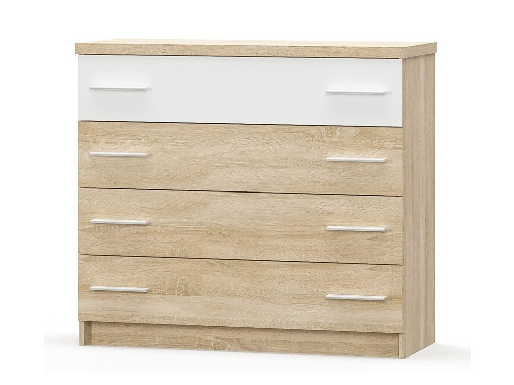Komoda se 4 zásuvkami z ložnicové řady. Moderní provedení v barvě dub sonoma v kombinaci s bílou dokonale doplní váš interiér. Komoda je vyrobena z kvalitní LTD desky. Nabídka komponentů této sektorové řady umožňuje sestavit si nábytek do ložnice nebo studentského pokoje dle vlastních představ. Dodáváme v demontovaném stavu.Additional parameters