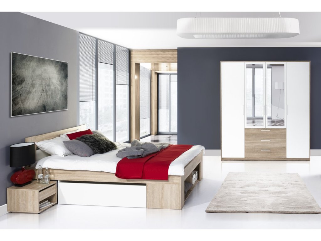 Ložnice MILO v moderním provedení. Korpus i dvířka jsou z kvalitního LTD, barevné provedení - dub sonoma s bílou. Sestava se skládá z postele ( 166 x 205 x 86 cm ) a šatní skříně 4-dveřové ( 187 x 58 x 206 cm ). Postel obsahuje na každé straně zásuvku pod postel a noční stolek, který lze zasunout pod postel. V nohách postele je regál. Postel neobsahuje rošt ani matraci, to je třeba doobjednat, vhodný rozměr 160 x 200 cm. Jednotlivé díly lze koupit zvlášť, v nabídce máme i komody. Dodáváme v demontovaném stavu.Additional parameters