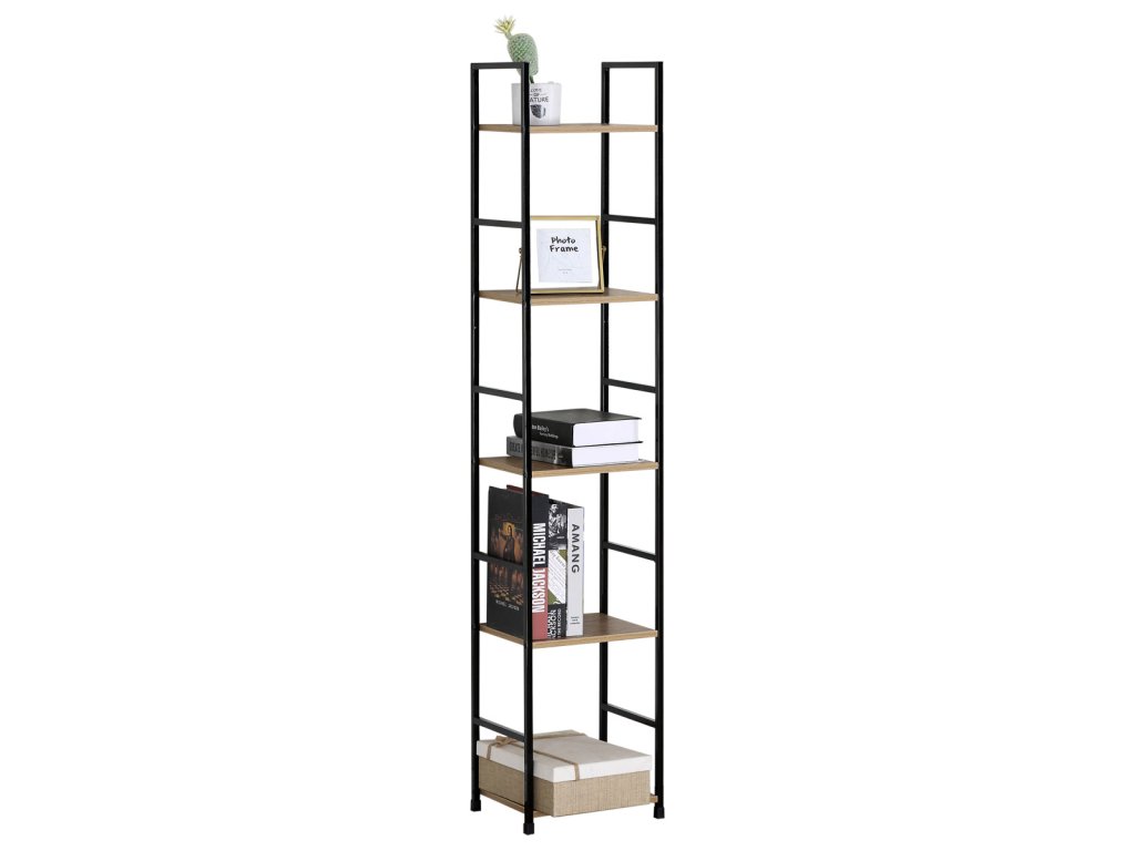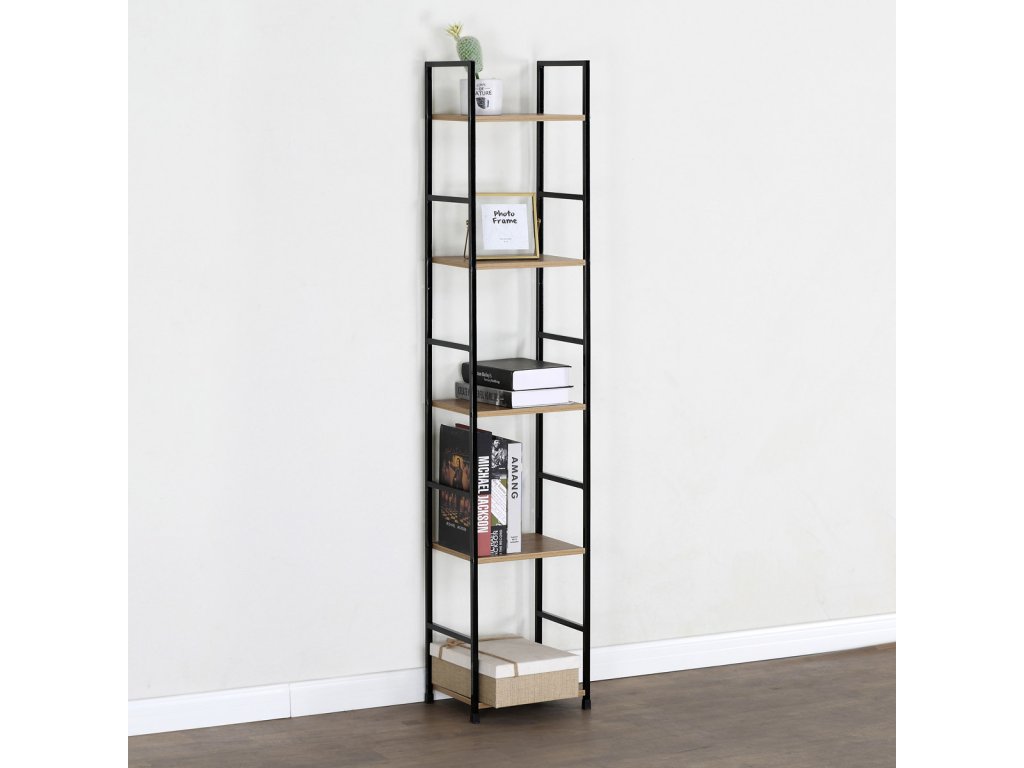 Regál, 5 polic, dekor dub, MDF, černý lak