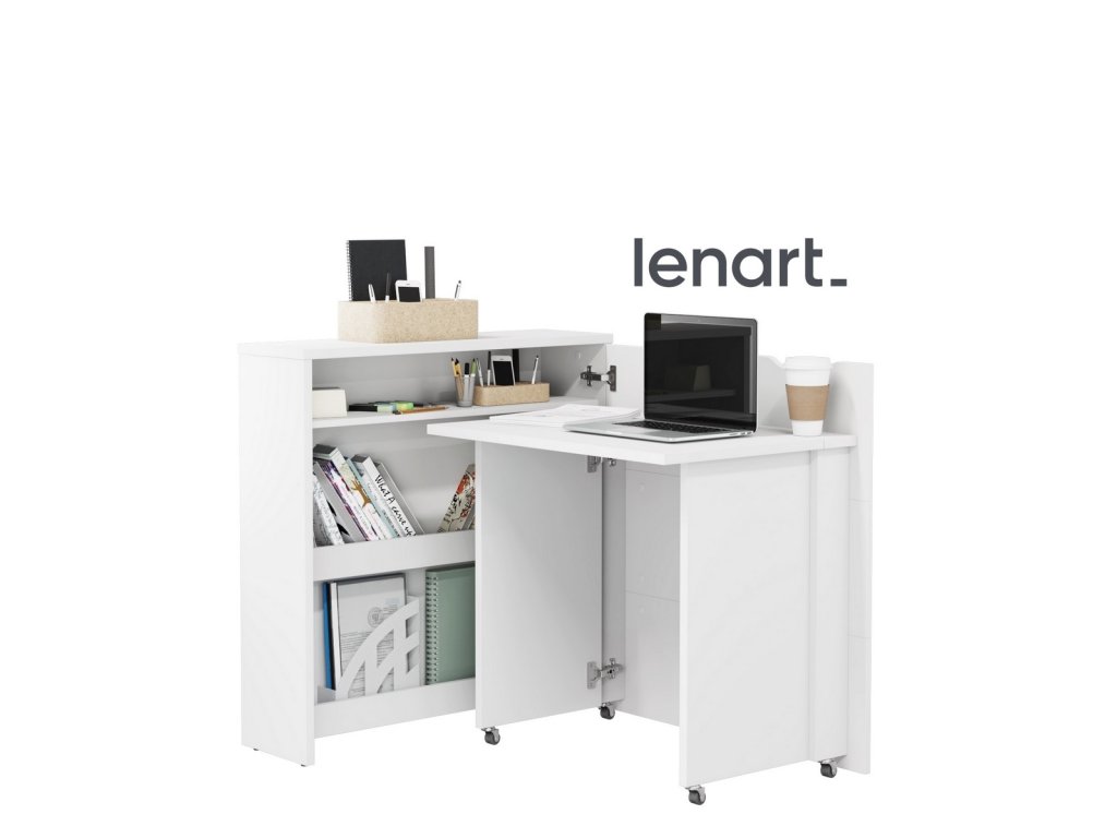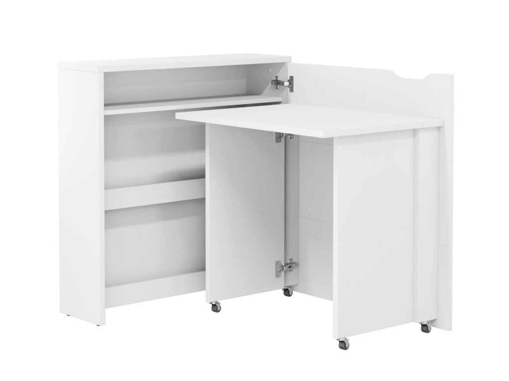 Rozkládací psací stůl v moderním a jednoduchém designu snadno složíte do komody a ušetříte tím spousty místa. Díky praktickým policím máte vše po ruce. Stůl je k dispozici ve dvou variantách - pravé nebo levé. Vyberte si ten, který lépe vyhovuje Vašim požadavkům. Kolečka umístěná pod bočními podpěrami usnadňují otevírání a zavírání stolu. Stůl je vyroben z lamina tloušťky 16 mm, pracovní deska stolu z lamina tloušťky 22 mm. Maximální nosnost police je 5 kg, pracovní desky 3 kg. Šířka stolu po rozložení je 136 cm. Dodáváme v demontovaném stavu.Additional parameters