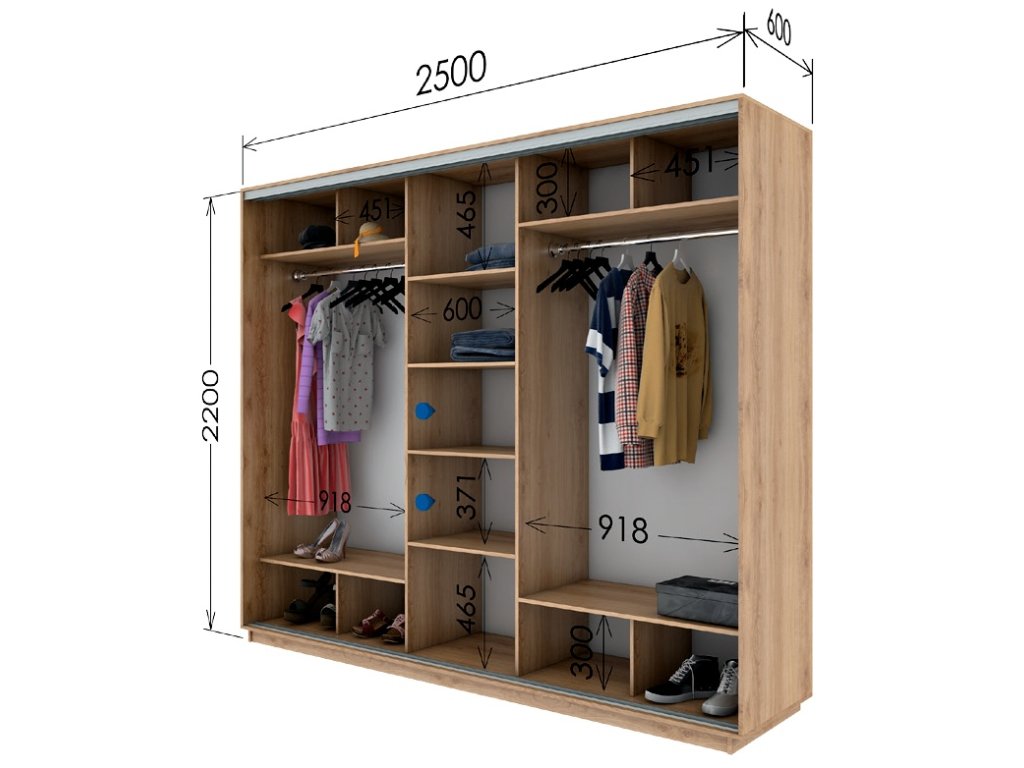 Velká šatní skříň s posuvnými dveřmi nabízí díky své velikosti více úložného prostoru, hodí se do každé ložnice či šatny. Posuvné dveře skvěle šetří místo v prostoru a díky zrcadlu po celé šířce bude Vaše ložnice opticky zvětšena a projasněna. Korpus je z kvalitní LTD desky v barvě wenge, posuvné dveře jsou osazeny zrcadly s pískováním. Nezvyklá výška 220 cm nabídne opravdu dostatek prostoru. Skříň má aluminiové kování a lišty. Vnitřní rozložení nabízí police a šatní tyč viz. obrázek. Dodáváme v demontovaném stavu. Možnost dokoupení praktických zásuvek do vnitřního prostoru skříně (modrá barva na perokresbě naznačuje, kam lze zásuvky umístit), naleznete v naší nabídce.Additional parameters