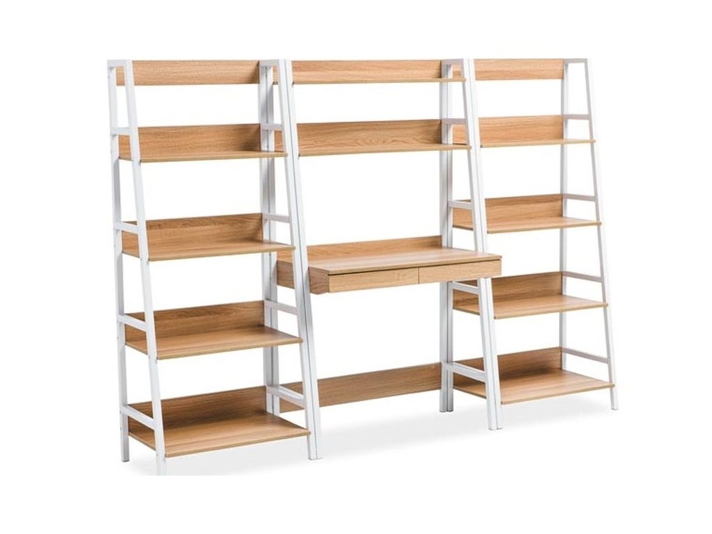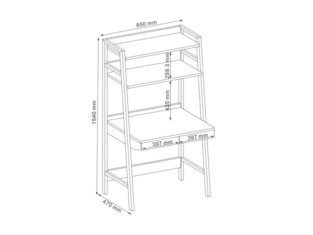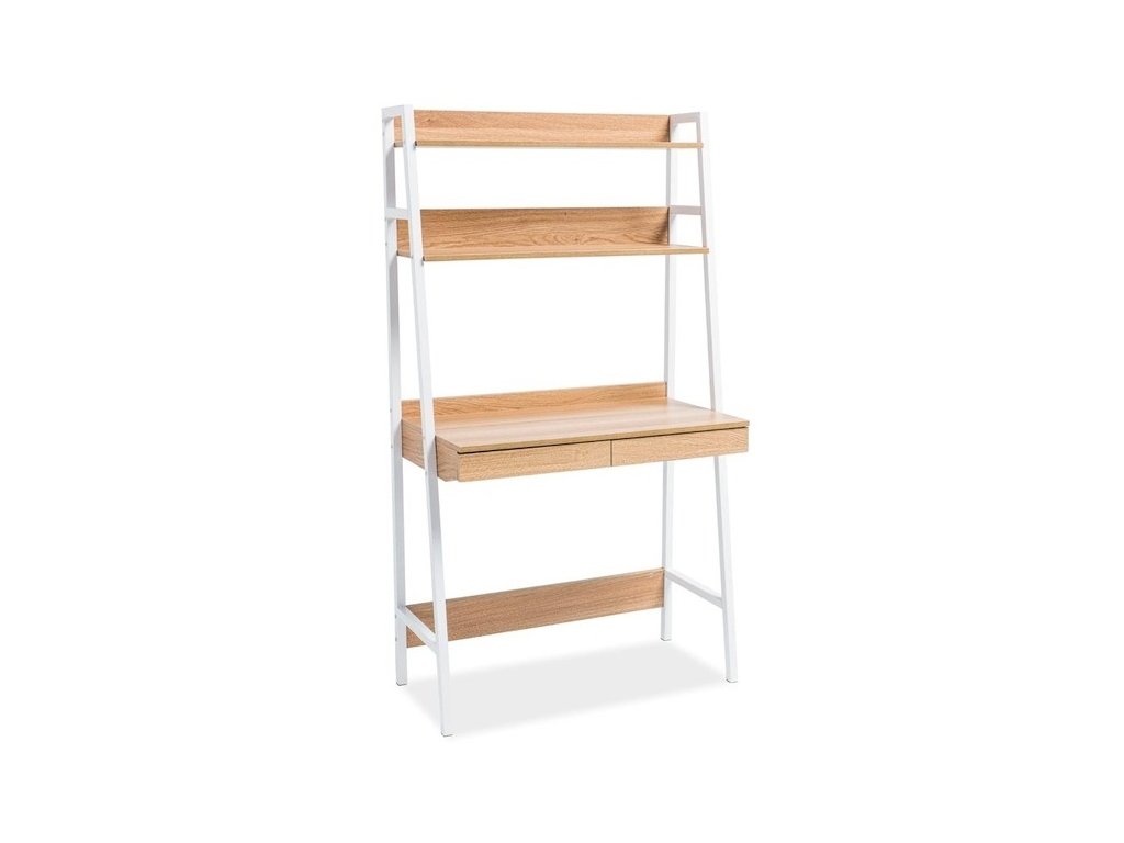 Jednoduchý, ale praktický pracovní stůl se dvěma zásuvkami. Zajímavá konstrukce nožek stolu má nahoře dvě poličky. Konstrukce je kovová v bílé barvě, deska z kvalitního MDF v barvě dub. Vhodný i pro menší pokoje.Additional parameters