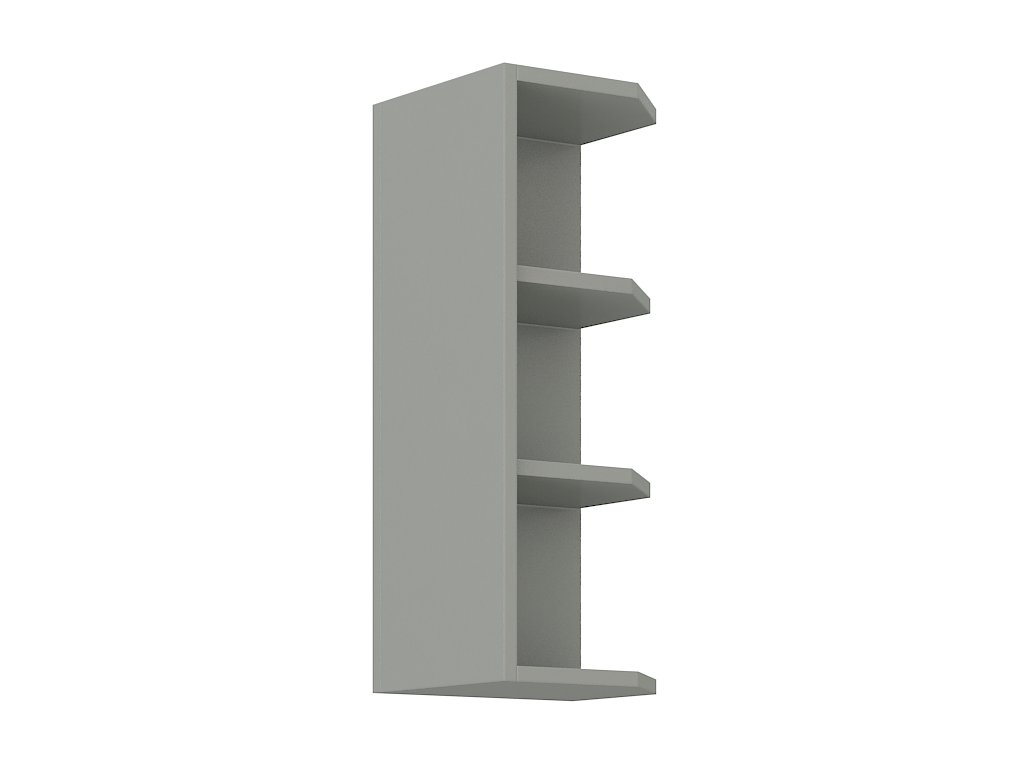 Otevřený horní roh KARMEN GREY na pravou stranu linky vyrobený z kvalitního lamina. Korpus je v barvě šedá. Rozměry regálu - šířka 30 cm, výška 71,5 cm, hloubka 30 cm. Tento roh vytvoří elegantní zakončení vaší kuchyňské linky. V naší nabídce naleznete další výběr skříněk k sestavení celé kuchyně.Additional parameters