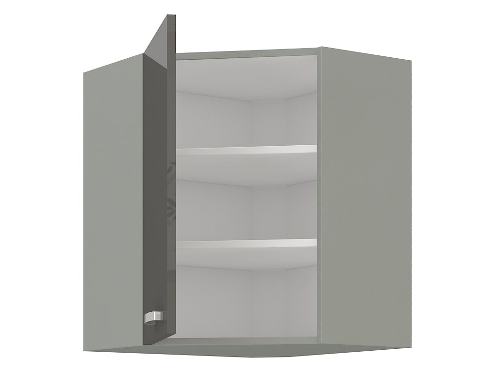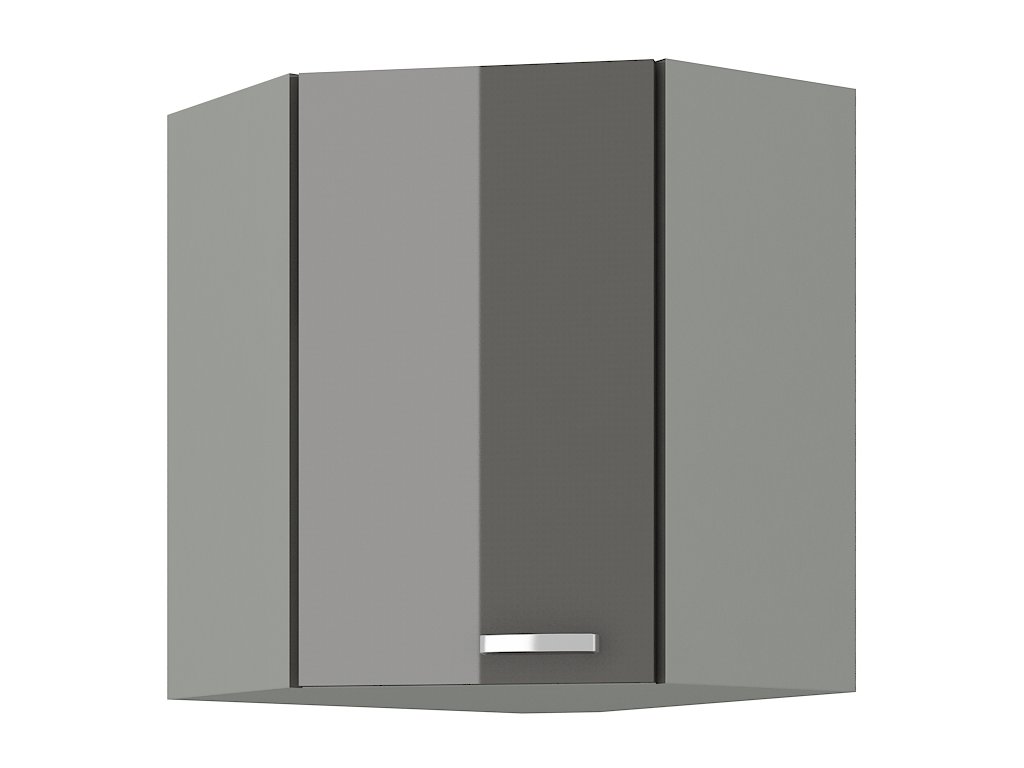 Horní skříňka rohová GREY vyrobená z kvalitního lamina a MDF. Korpus je v barvě šedá a dvířka v barvě grey šedá v lesku. Rozměry skříňky - šířka 59 x 59 cm, výška 71,5 cm, hloubka 31 cm. Úchyty jsou z kovu. Dvířka mají levé otvírání. V naší nabídce naleznete další výběr skříněk k sestavení celé kuchyně.Additional parameters