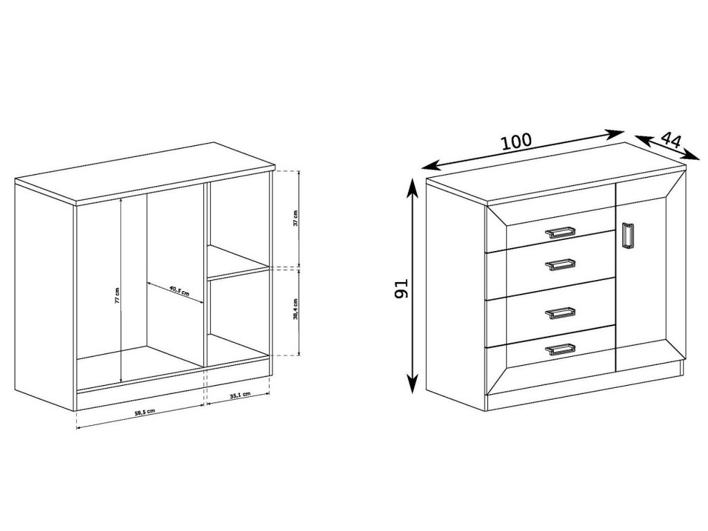 Komoda 1d4s ze sektorové řady TADEÁŠ. Komoda má 1 dvířka a 4 praktické zásuvky, za dvířky je 1 police. Systém TADEÁŠ je exkluzivní kolekce navržena v duchu vintage. Celá řada se vyznačuje elegancí a jednoduchými tvary, které zaručují plné využití prostoru. Nábytek je vyroben z velmi kvalitní LTD o tloušťce 16 mm, horní deska zesílena na 32 mm, lišty na čele nábytku jsou MDF, hrany ABS. Tvrzené sklo ve vitrínách je jemně zdobené. Elegantní úchyty jsou z kovu. Barevné provedení dub stoletý. Dodáváme v demontovaném stavu.Additional parameters