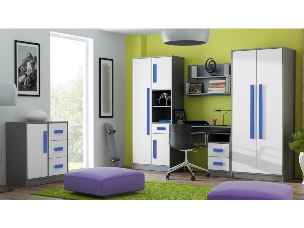 Skříňka ze sektorové řady GYT, která se vyznačuje netradičním zpracováním barev a originalitou úchytů. Tento styl nábytku zaujme každou mladší generaci. Skříň je vyrobena z kvalitní LTD desky hraněné ABS lištou. Korpus je v barvě šedá antracit, dveře jsou bílé matné. Úchytky jsou v modré barvě. Uvnitř skříňky jsou police. Sektorový nábytek GYT má široký výběr prvků, který Vám zaručí sestavit si dětský nebo studentský pokoj, ložnici či kancelář podle svých potřeb, přání a představ. Dodáváme v demontovaném stavu.Doplňkové parametry