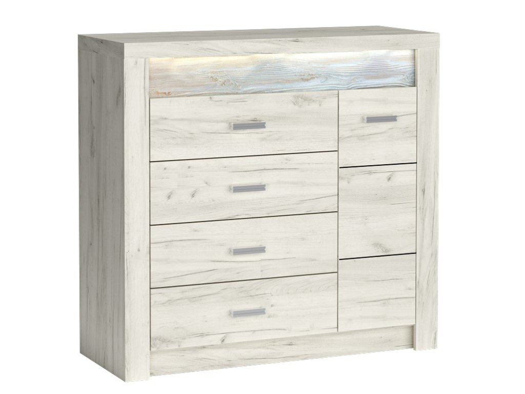 Komoda ze sektorové řady. Komoda má na levé straně 4 zásuvky, na pravé je jedna skříňka za dvířky jsou 2 police. Systém je exkluzivní kolekce navržena v moderním duchu. Vsazením LED osvětlení do ozdobné rýhované lišty, které najdete v naší další nabídce k dokoupení, je zvýrazněn rustikální vzhled masivního dřeva. Celá řada se vyznačuje elegancí a jednoduchými tvary, které zaručují plné využití prostoru. Nábytek je vyroben z kvalitního lamina s ABS hrany ( 0,5-0,8 mm ). Barevné provedení jasan bílý. Dodáváme v demontovaném stavu.Doplňkové parametry