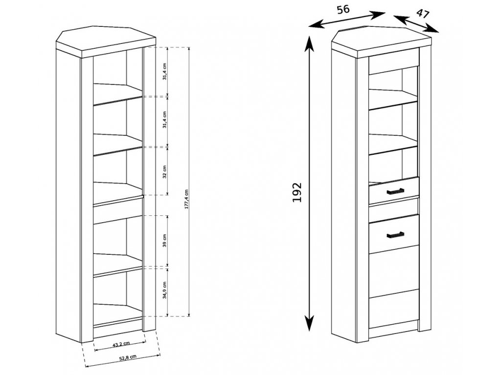 Rohová vitrína kombinovaná. Uprostřed je 1 zásuvka, v horní polovině je prosklená vitrína se dvěma policemi, dole je skříňka s jednou policí. Systém je exkluzivní kolekce navržena v moderním duchu. Vsazením LED osvětlení do ozdobné rýhované lišty, které najdete v naší další nabídce k dokoupení, je zvýrazněn rustikální vzhled masivního dřeva. Možnost dokoupení LED bodového osvětlení i u skleněných polic. Celá řada se vyznačuje elegancí a jednoduchými tvary, které zaručují plné využití prostoru. Nábytek je vyroben z kvalitního lamina s ABS hrany ( 0,5-0,8 mm ). Barevné provedení jasan tmavý. Vitrína má univerzální otvírání dvířek. Dodáváme v demontovaném stavu.Doplňkové parametry