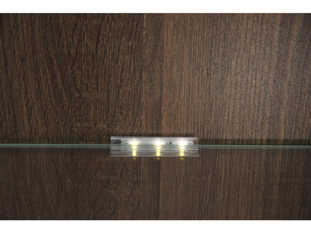 Vitrína s dvířky a policemi. Systém je exkluzivní kolekce navržena v moderním duchu. Vsazením LED osvětlení do ozdobné rýhované lišty, které najdete v naší další nabídce k dokoupení, je zvýrazněn rustikální vzhled masivního dřeva. Možnost dokoupení LED bodového osvětlení i u skleněných polic. Celá řada se vyznačuje elegancí a jednoduchými tvary, které zaručují plné využití prostoru. Nábytek je vyroben z kvalitního lamina s ABS hrany ( 0,5-0,8 mm ). Barevné provedení jasan tmavý. Dodáváme v demontovaném stavu.Doplňkové parametry