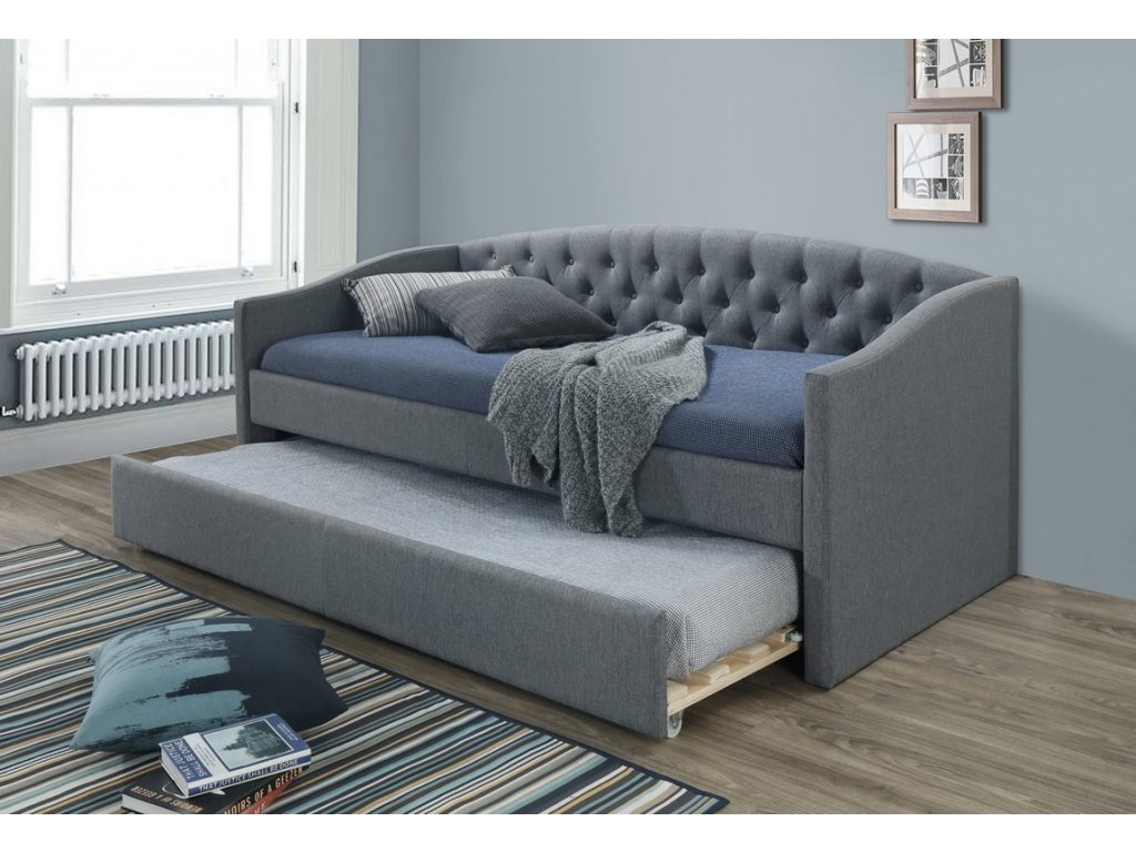 Rozkládací čalouněná postel originálního vzhledu. Ve složeném stavu může plnit funkci pohovky a tak je vhodná také do obývacího pokoje či malých obytných prostor, kde rádi využijete možnost krásného stylového posezení přes den a pohodlného spaní pro dva na noc. Konstrukce je potažena látkou v šedé barvě. Rošty jsou součástí postele. Matrace nutno doobjednat. Horní matraci o rozměrech 90 x 200 cm, dolní matraci o rozměrech max. 90 x 195 x 18 cm. Dodáváme v demontovaném stavu.Doplňkové parametry