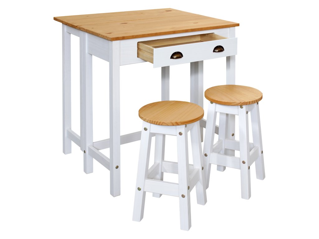 materiál masiv borovice voskovaná v medovém a bílém odstínu skládací stůl se zásuvkou, dvě barové židličky rozměr složeného stolu (š/h/v) 80 × 42 × 84 cm rozměr rozloženého stolu (š/h/v) 80 × 72 × 84 cm rozměr židličky (š/h/v) 30 × 30 × 51 cmDoplňkové parametry