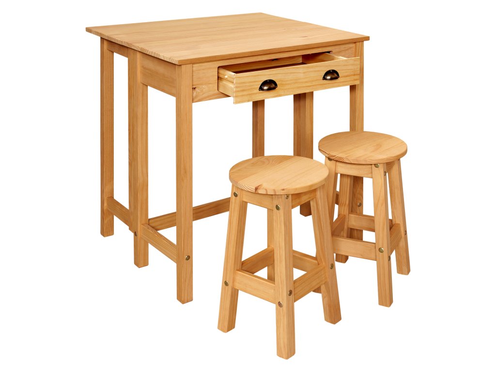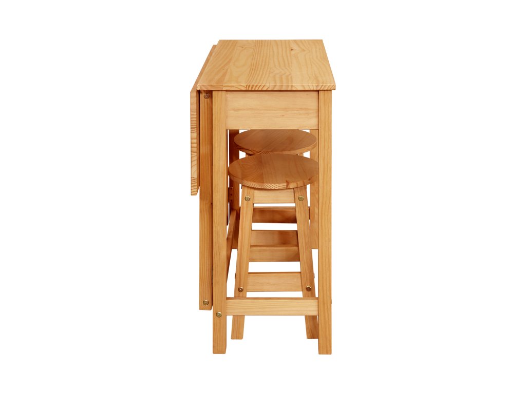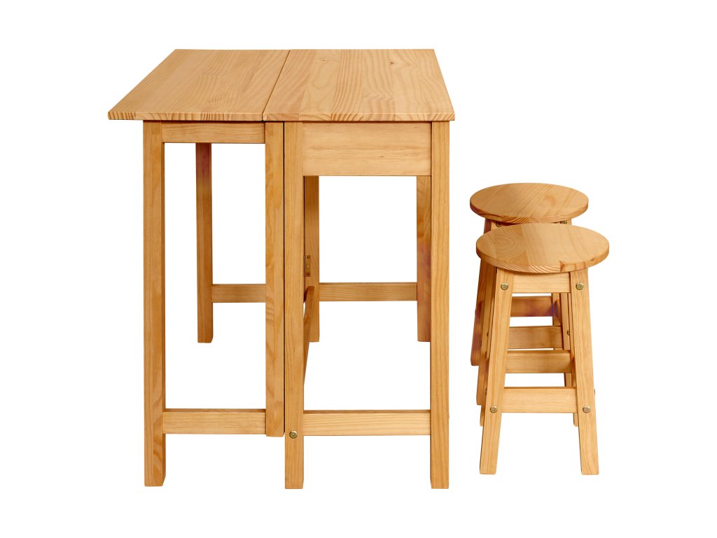 materiál masiv borovice voskovaná v medovém odstínu skládací stůl se zásuvkou, dvě barové židličky rozměr složeného stolu (š/h/v) 80 × 42 × 84 cm rozměr rozloženého stolu (š/h/v) 80 × 72 × 84 cm rozměr židličky (š/h/v) 30 × 30 × 51 cmDoplňkové parametry