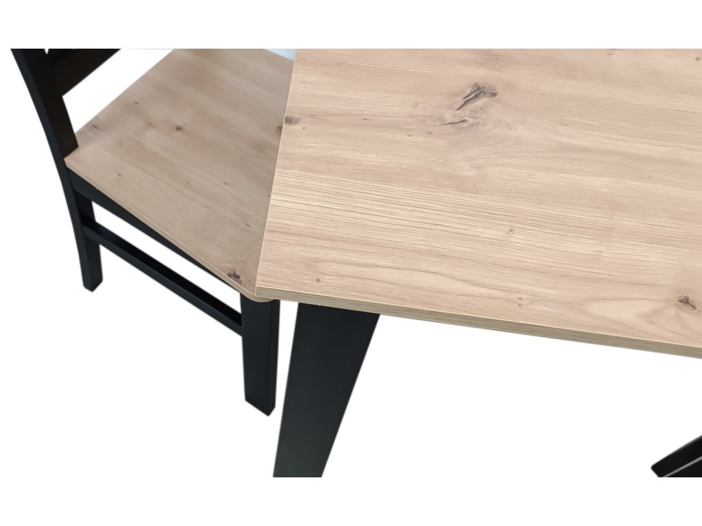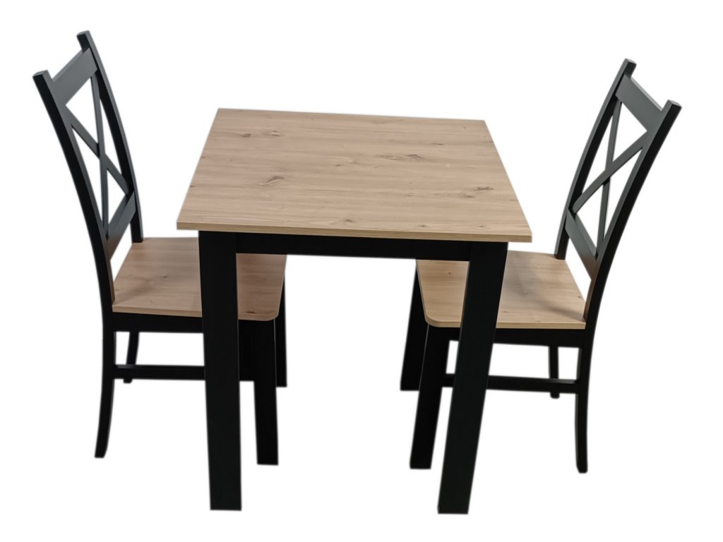 Jídelní sestava 1 stolu a 2 židlí. Deska jídelního stolu je vyrobena z LTD, sedák u židle z HDF, obojí jsou v barvě dub artisan, nohy stolu jsou z materiálu MDF a konstrukce židlí z bukového dřeva, obojí v barvě černá mat, vše hraněné ABS páskou. Dodáváme v demontovaném stavu.Doplňkové parametry