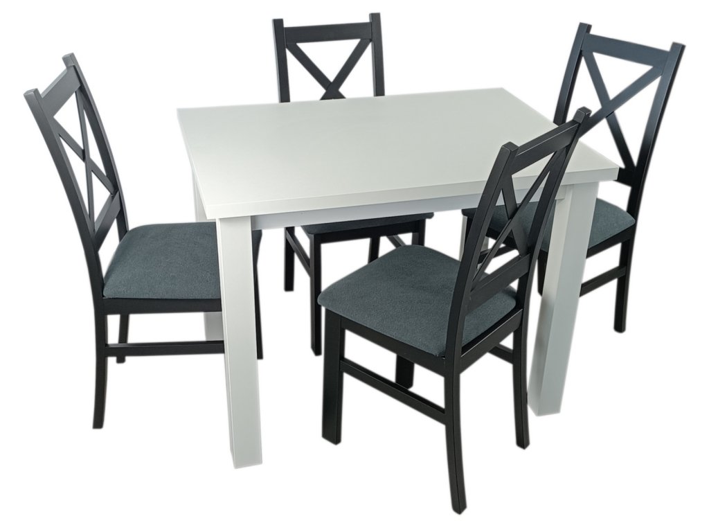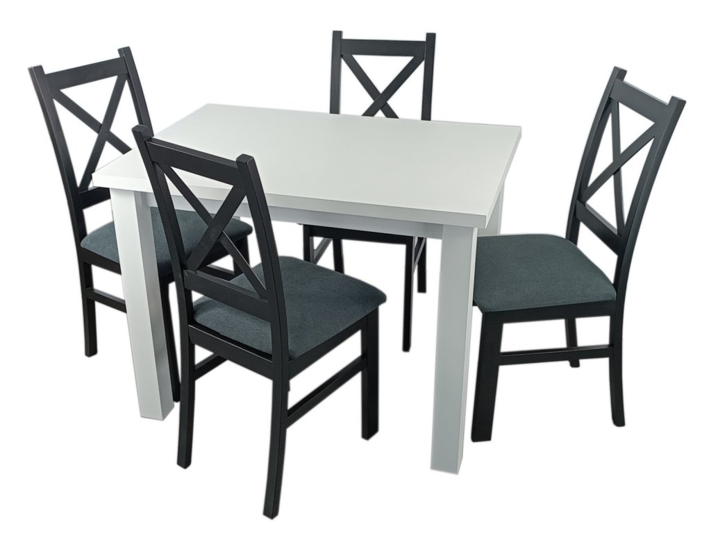 Jídelní sestava 1 stolu a 4 židlí. Deska jídelního stolu je vyrobena z LTD, nohy stolu jsou z materiálu MDF a konstrukce židlí z bukového dřeva, vše hraněné ABS páskou. Barva stolu je matná bílá, židle je černá mat. Židle má čalouněný sedák v látce Moric 8 (černá), výplň sedáku PUR pěna T30. Jednotlivé díly lze zakoupit zvlášť. Dodáváme v demontovaném stavu.Doplňkové parametry