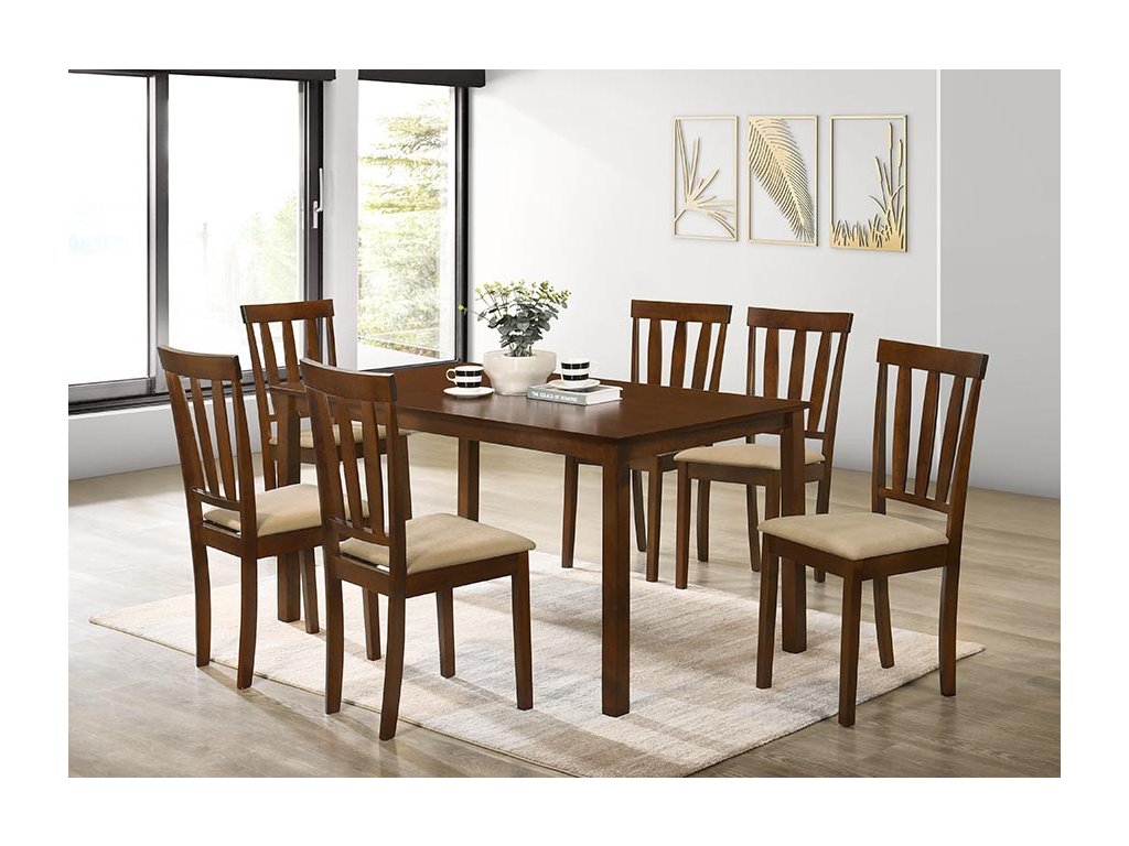 Moderní jídelní sestava 1 stolu + 6 židlí. Stůl je vyrobený z kvalitní MDF desky tl. 18 mm potažené přírodní dýhou v barvě mocca, která tvoří jídelní plochu stolu. Nohy stolu jsou dřevěné v barvě mocca a mají tloušťku 53 mm. Konstrukce židle je z kvalitního přírodního dřeva v odstínu mocca. Čalounění je vyrobeno z potahové látky v barvě béžová velvet. Stůl má rozměry (ŠxVxH cm) - 145,5 x 73,8 x 84 cm, židle má rozměry 42 x 93 x 57 cm. Dodáváme v demontovaném stavu.Doplňkové parametry