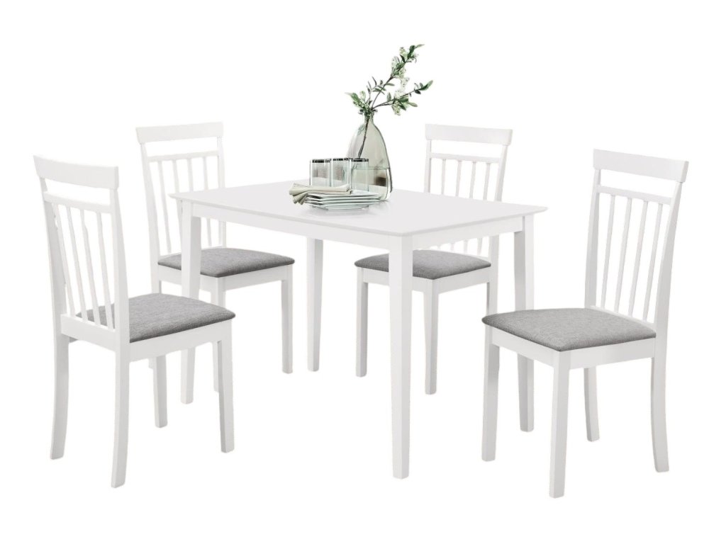 Jídelní sestava je navržena v oblíbeném barevném provedení. Díky jednoduchému designu a neutrální bílé barvě je výjimečný a hodí se do každého interiéru. Pomůže Vám vkusně a jednoduše zařídit jídelnu. Deska stolu je vyrobena z MDF desky dýhované přírodním dřevem. Jídelní set se skládá ze stolu a čtyř židlí. Rozměry stolu: 112 × 72 × 73,8 cm. Rozměry židle: 40 × 49 × 94 cm. Jednotlivé díly je možné zakoupit i samostatně. Dodáváme v demontovaném stavu.Doplňkové parametry