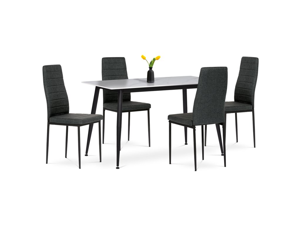 Moderní jídelní set Autronic v industriálním stylu je skvělou volbou pro vaši jídelnu. Obdélníkový stůl s deskou ze slinuté keramiky v bílém mramorovém dekoru působí elegantně a je odolný vůči poškrábání. Stabilitu zajišťují černé kovové nohy s jemně kónickým tvarem. Pohodlné židle mají čalounění z hladké černé látky a ergonomicky tvarovanou opěrku pro maximální komfort. Černé kovové nohy ladí se stolem a dodávají celku jednotný vzhled. Ideální volba pro stylové a funkční stolování.Doplňkové parametry