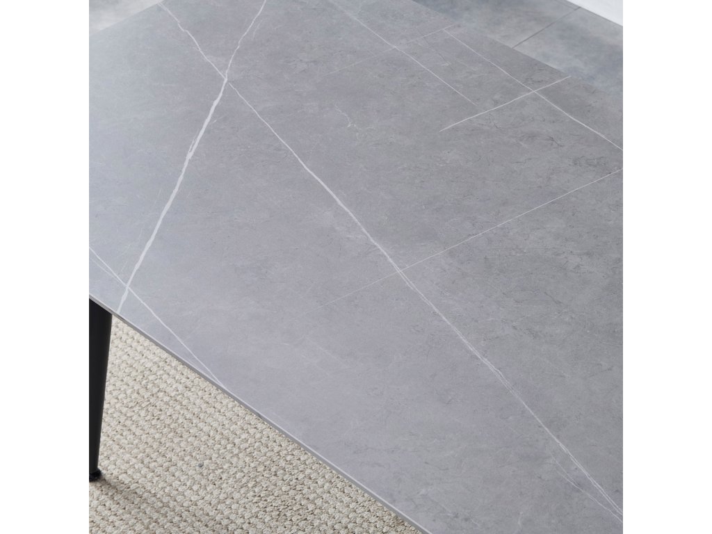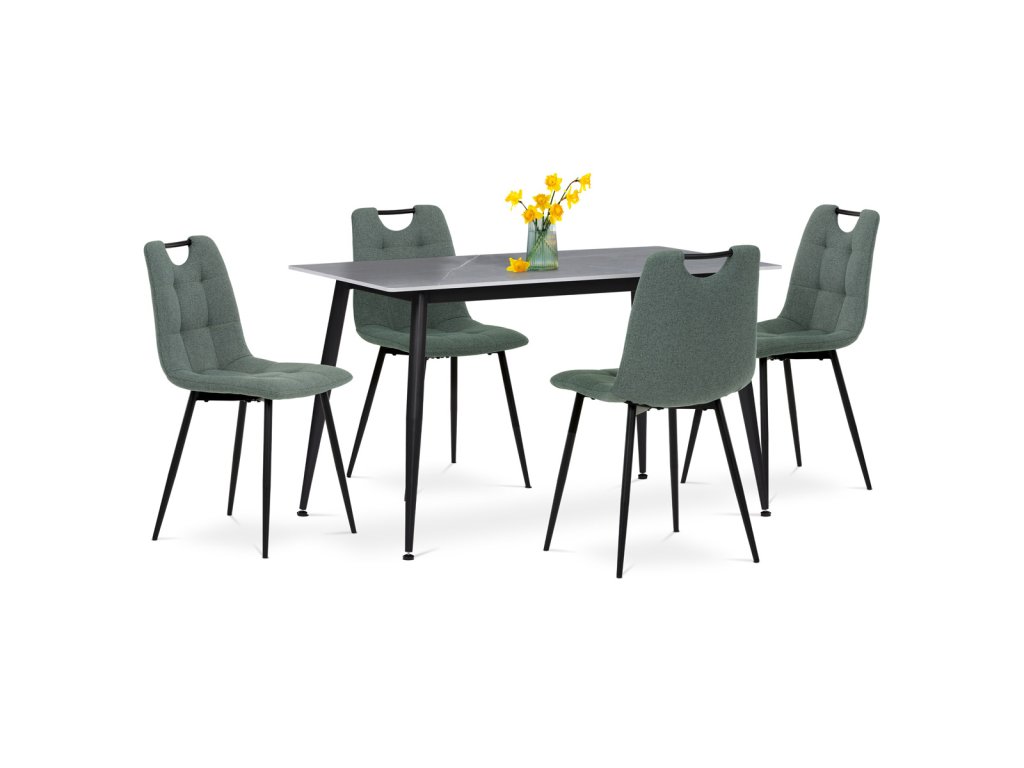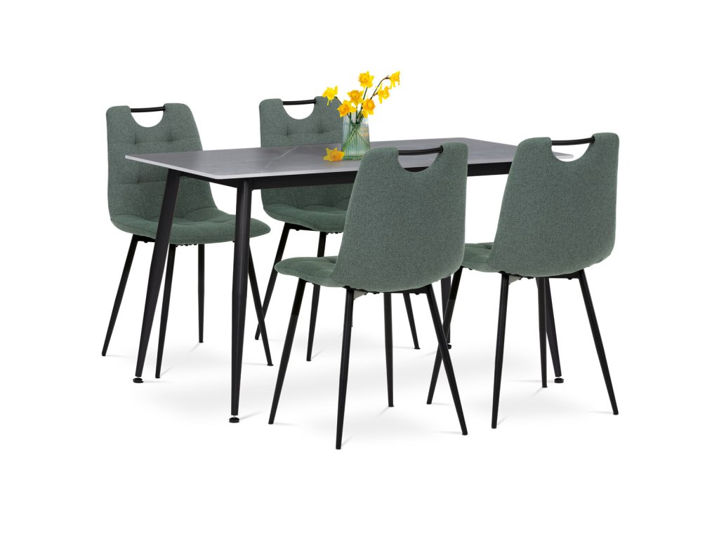 Moderní jídelní set Autronic přináší dokonalou kombinaci elegance a funkčnosti. Obdélníkový stůl s deskou ze slinuté keramiky v imitaci šedého mramoru dodá jídelně luxusní nádech, zatímco stabilní kovové nohy v černém provedení zajistí pevnost a odolnost. Čtyři pohodlné židle čalouněné zelenou látkou s měkkým polstrováním zaručují maximální komfort při sezení. Stylový detail v podobě černého madla na opěradle usnadňuje manipulaci. Ideální volba pro moderní interiéry, kde se snoubí praktičnost s nadčasovým designem.Doplňkové parametry
