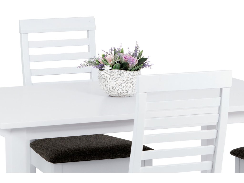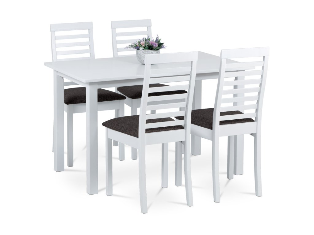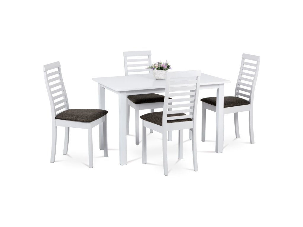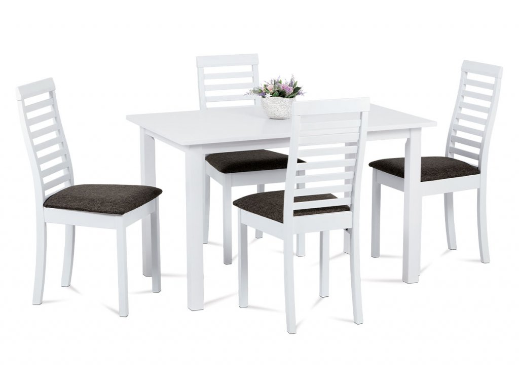 Jídelní set 1+4 v bílé matné úpravě je vyroben z masivního dřeva, které zajišťuje pevnost a stabilitu celého setu. Stůl o rozměrech 120x75x75 cm nabízí dostatek prostoru pro pohodlné stolování až pro čtyři osoby. Masivní nohy stolu i židlí přispívají k dlouhé životnosti a odolnosti proti běžnému opotřebení. Židle mají ergonomicky tvarovaná opěradla s vodorovnými příčkami a čalouněné sedáky v tmavém odstínu, které zvyšují komfort při sezení. Celkový design je jednoduchý a nadčasový, vhodný do různých typů interiérů, kde oceníte kvalitní materiály a precizní zpracování.Doplňkové parametry