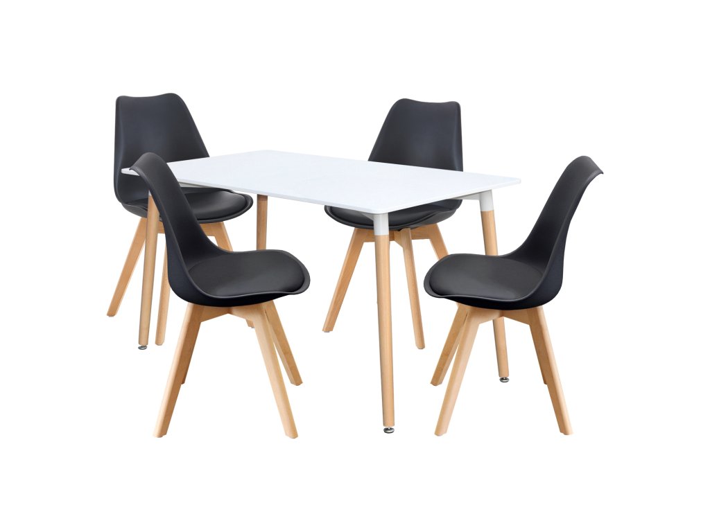 jídelní stůl 3152 a 4 jídelní židle 3144 stůl: deska MDF, barevné provedení bílá kovová konstrukce, barevné provedení bílá kulaté nohy, materiál masiv buk nastavitelné plastové kluzáky s pochromovanou krytkou židle: korpus PP, sedák kůže – imitace, barevné provedení černá nohy masiv buk, výška sedu židle 46 cm rozměr stolu (š/h/v): 140 × 90 × 74 cm rozměr židle (š/h/v): 49 × 54 × 83 cmDoplňkové parametry