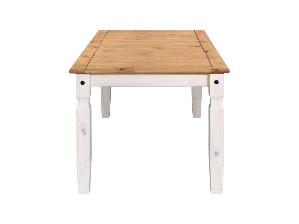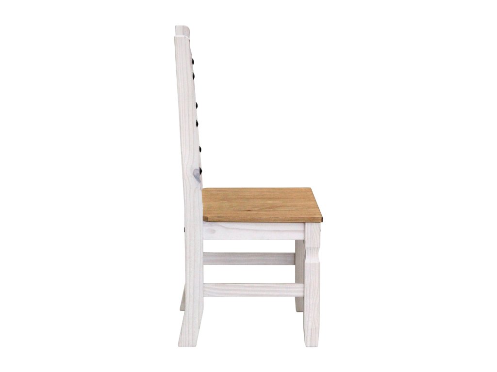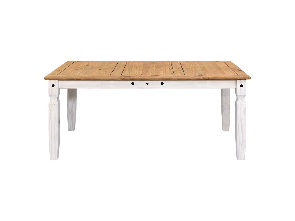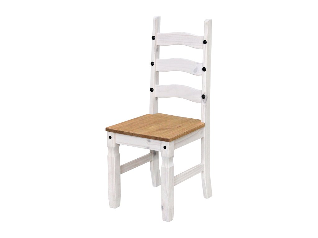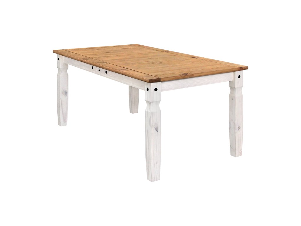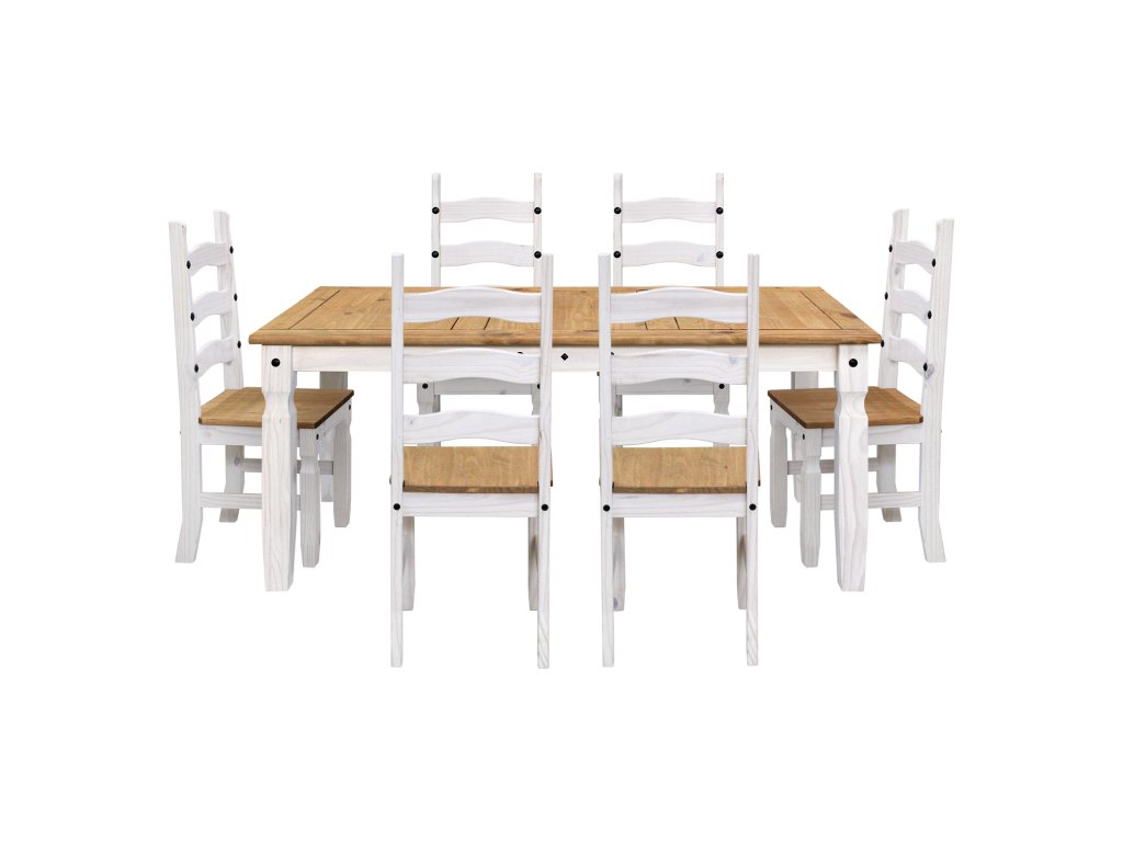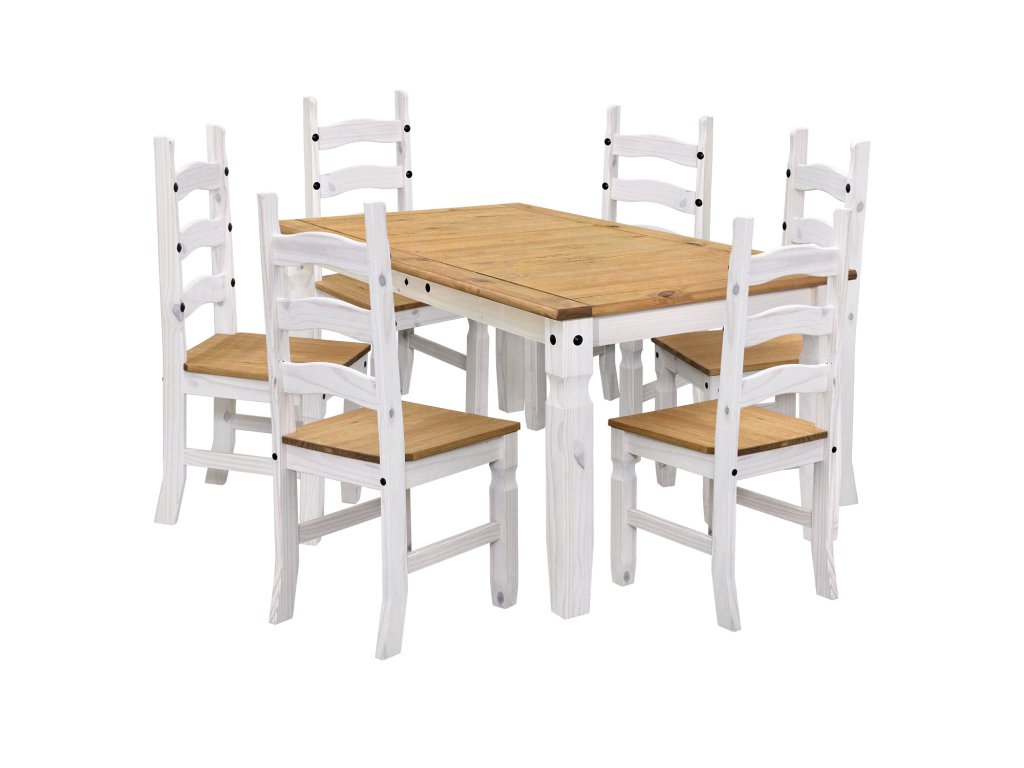 jídelní stůl 16110B a 6 jídelních židlí 160204B stůl i židle materiál masiv borovice voskovaná v bílém odstínu horní deska stolu i židle masiv borovice voskovaná v medovém odstínu výška sedu židle 46 cm rozměr stolu (š/h/v): 92 × 178 × 76 cm rozměr židle (š/h/v): 45 × 50 × 107 cm součást sestavy Corona bíláDoplňkové parametry