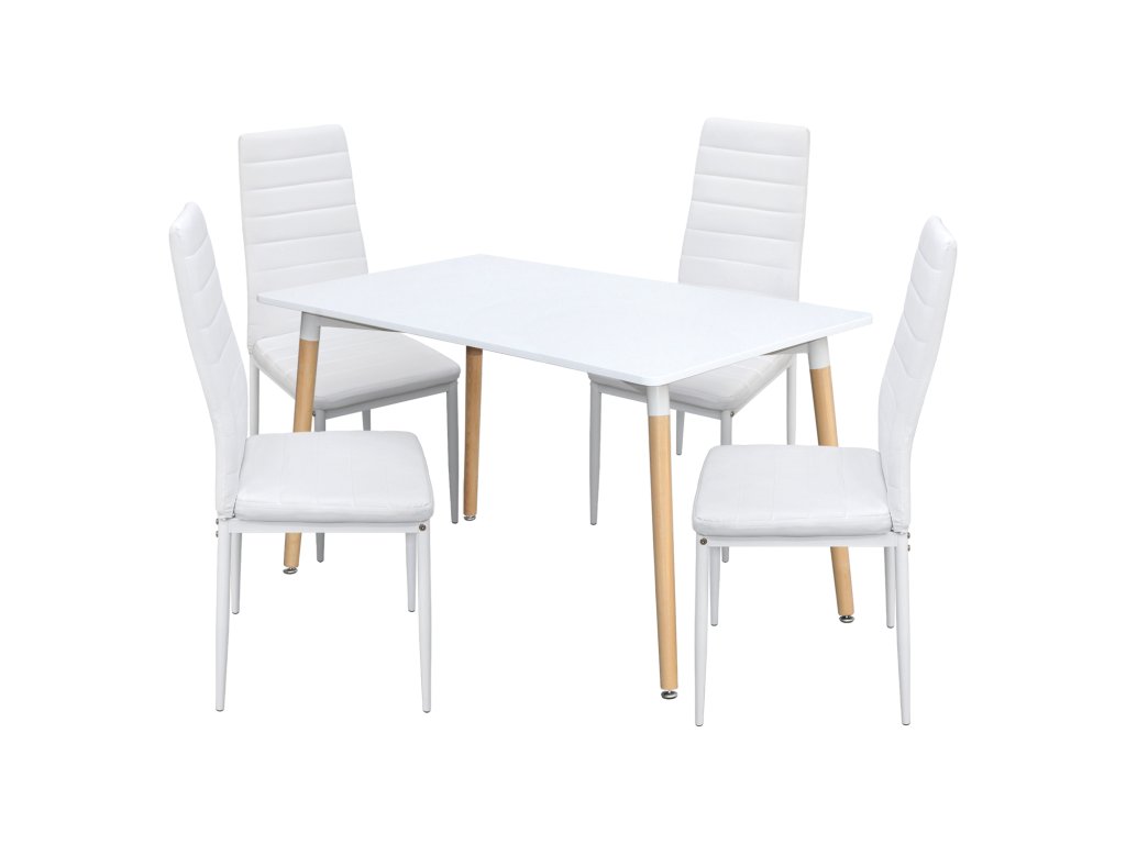 jídelní stůl ONE 3152 a 4 jídelní židle SIGMA 3164 stůl: deska MDF, barevné provedení bílá kovová konstrukce, barevné provedení bílá kulaté nohy, materiál masiv buk židle: potah kůže – imitace, barevné provedení bílá kovové nohy a konstrukce, výška sedu židle 47 cm rozměr stolu (š/h/v) 140 × 90 × 74 cm rozměr židle (š/h/v) 42 × 41 × 98 cmDoplňkové parametry